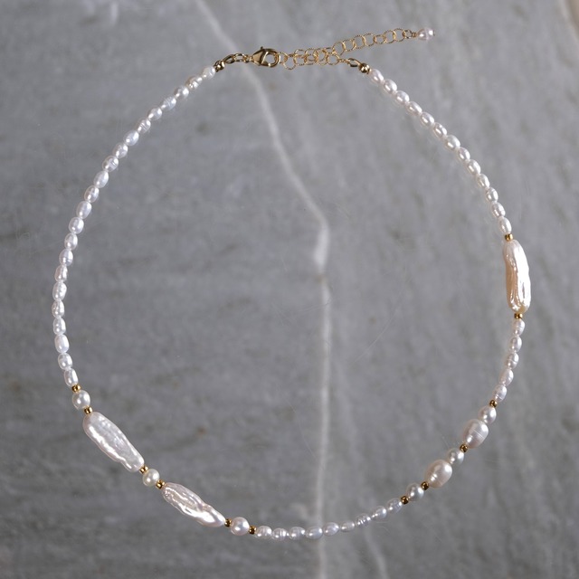 淡水バロックパールのネックレス 細長い形や小さなライス型など様々なかたちの淡水パールの組み合わせがポイントで、フォーマルになりすぎず日常使いやモードな装いにもぴったりです。 バロックパールはカジュアルなTシャツやカットソーからブラウス、ワンピースまでお洋服に合わせやすく装いがワンランクアップします。 季節を問わずお使いいただけるので万能に活躍するネックレスです。 プレゼントにもおすすめです◎ボックスに入れてお届け。 アジャスターにより長さを調節をでき、チェーンネックレスとの重ね付けなどもお楽しみいただけます。(34㎝でチョーカーに、最長40㎝でレイヤードに) ✶パールについて 「月のしずく」ともいわれているパール。神秘的でロマンティックな存在で、 持ち主からネガティブなエネルギーを遠ざけ、女性の内面の美しさをひきだしてくれると言われています。 6月の誕生石。 ▽ブレスレット https://nuna.theshop.jp/items/112128181 ▽イヤリング・ピアス 【クオーツ】 https://nuna.theshop.jp/items/112126035 【シトリン×クロムダイオプサイド イエロー×グリーン】 https://nuna.theshop.jp/items/112130475 ▼重ね付けにおすすめの羊コインネックレス(ゴールド) https://nuna.theshop.jp/items/84868876 ■サイズ 全長 約40㎝(アジャスター約5㎝含む) サイズを短く着用する場合 全長 約35㎝ ■素材 淡水真珠 アジャスターチェーン:14kgf ゴールドフィールド その他カニカン留め具等:K18gpメッキ ※ラフな形が特徴のバロックパールを使用しています。形や大きさに個体差がございます。 また表面部分等にくぼみや線などがみられます。 ※パールは水や汚れを放置しますとテリがなくなります。 着用後は、金属部分の変色も防げますので柔らかい布で優しく拭いてください。 また、チャック袋など空気に触れないように密閉して保管しますとさらに変色を防ぐことができます。 ●繊細なつくりになっております。モチーフ部分を過度な力で引っ張りますと破損の原因となります。 ●表示されている写真は、撮影環境や撮影時の天候など、お客様の端末環境により色合いが実際と異なる場合がございますが、ご了承ください。 ●修理も承っております。長くご愛用頂けるようにアフターケアなどお気軽にご相談ください。