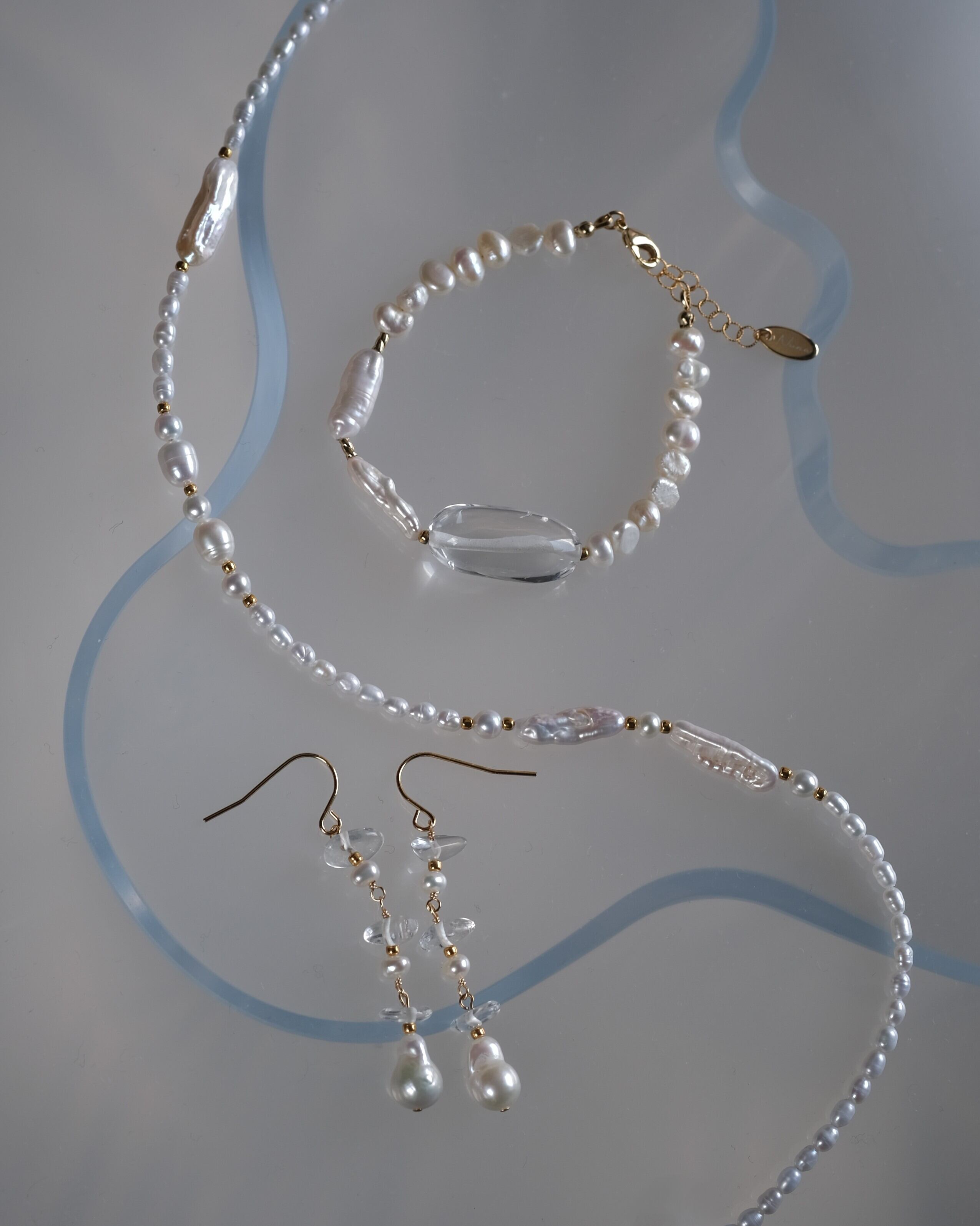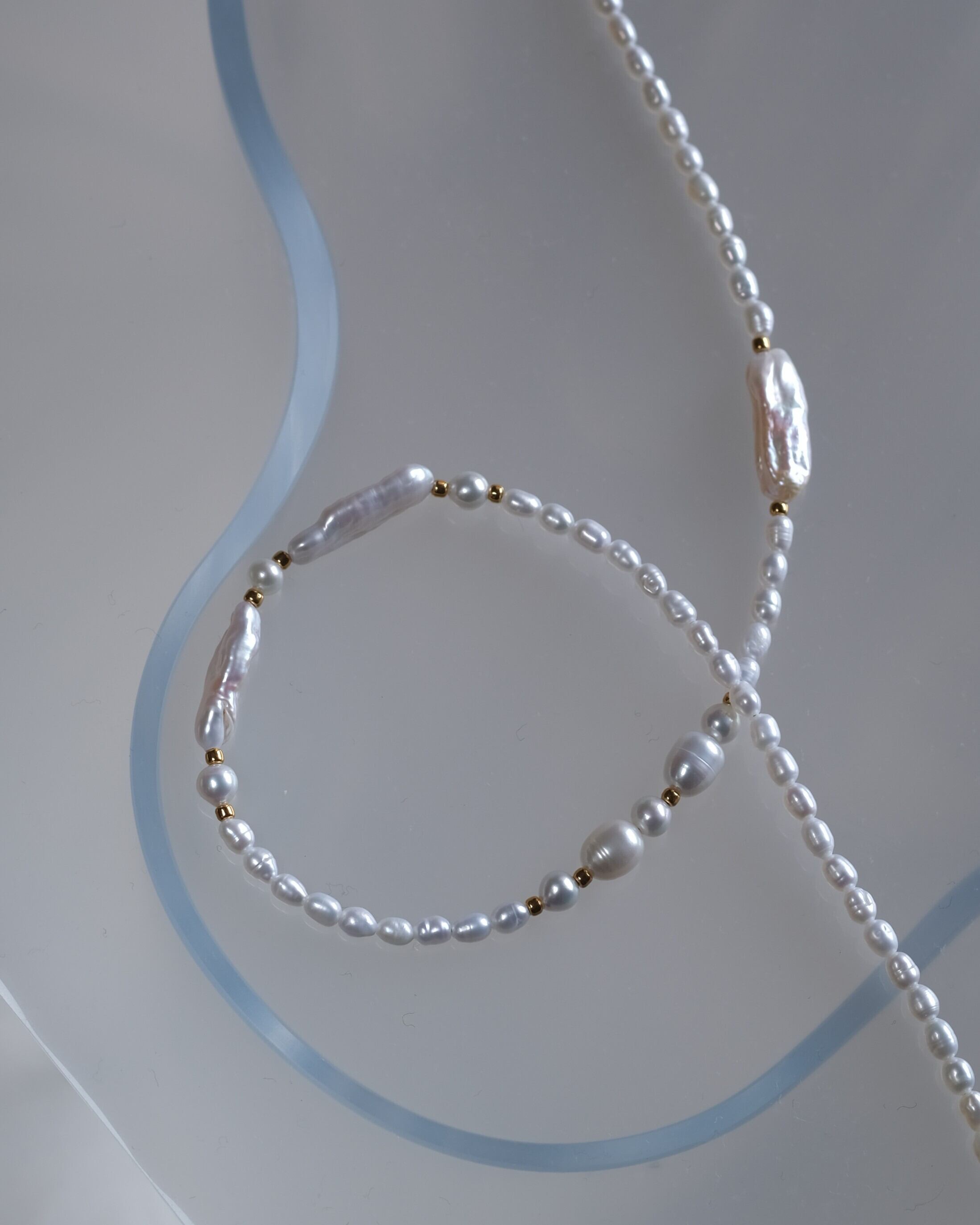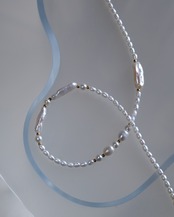 細長い形や小さなライス型など様々なかたちの淡水パールの組み合わせがポイントで、フォーマルになりすぎず日常使いやモードな装いにもぴったりです。