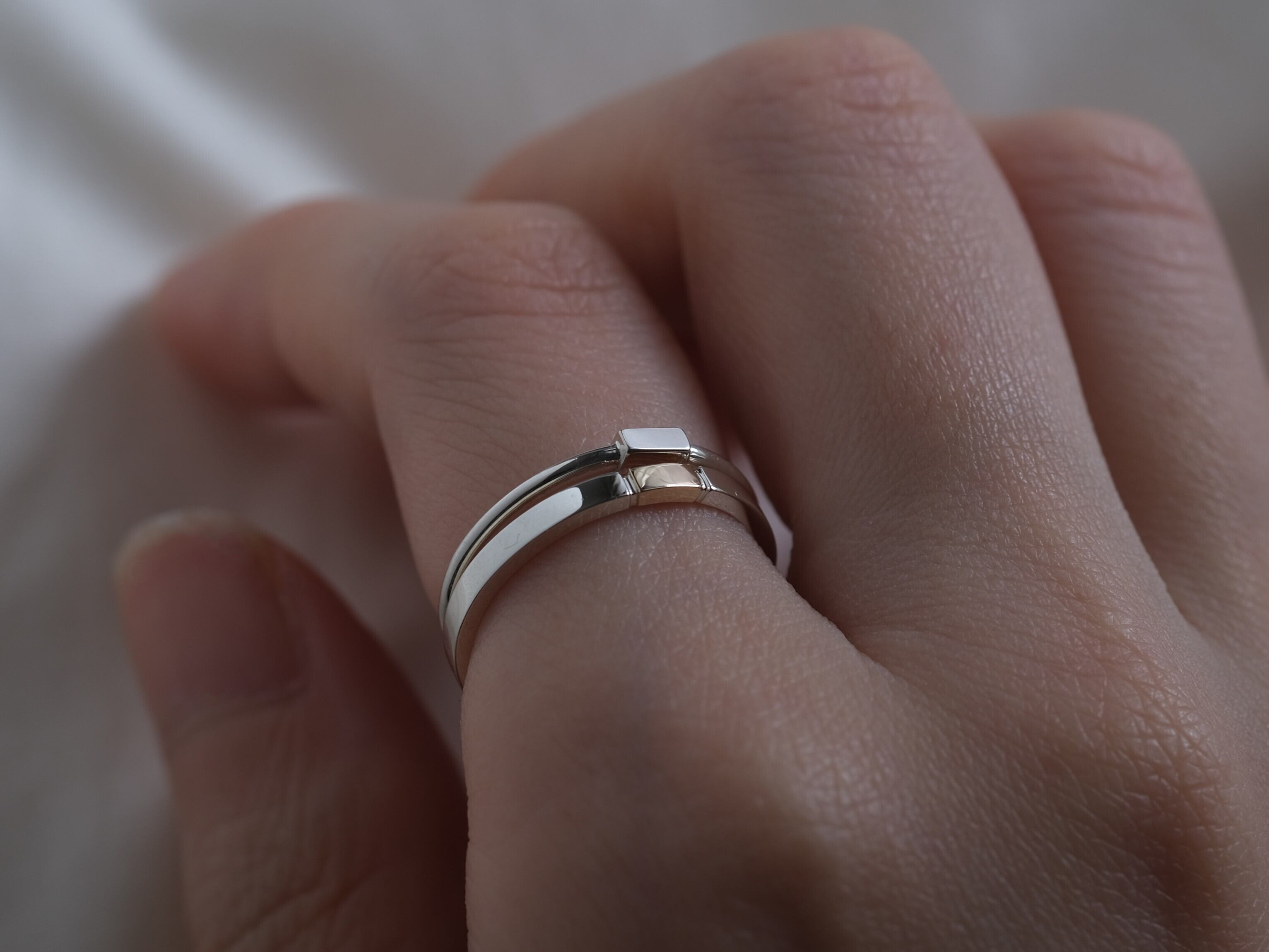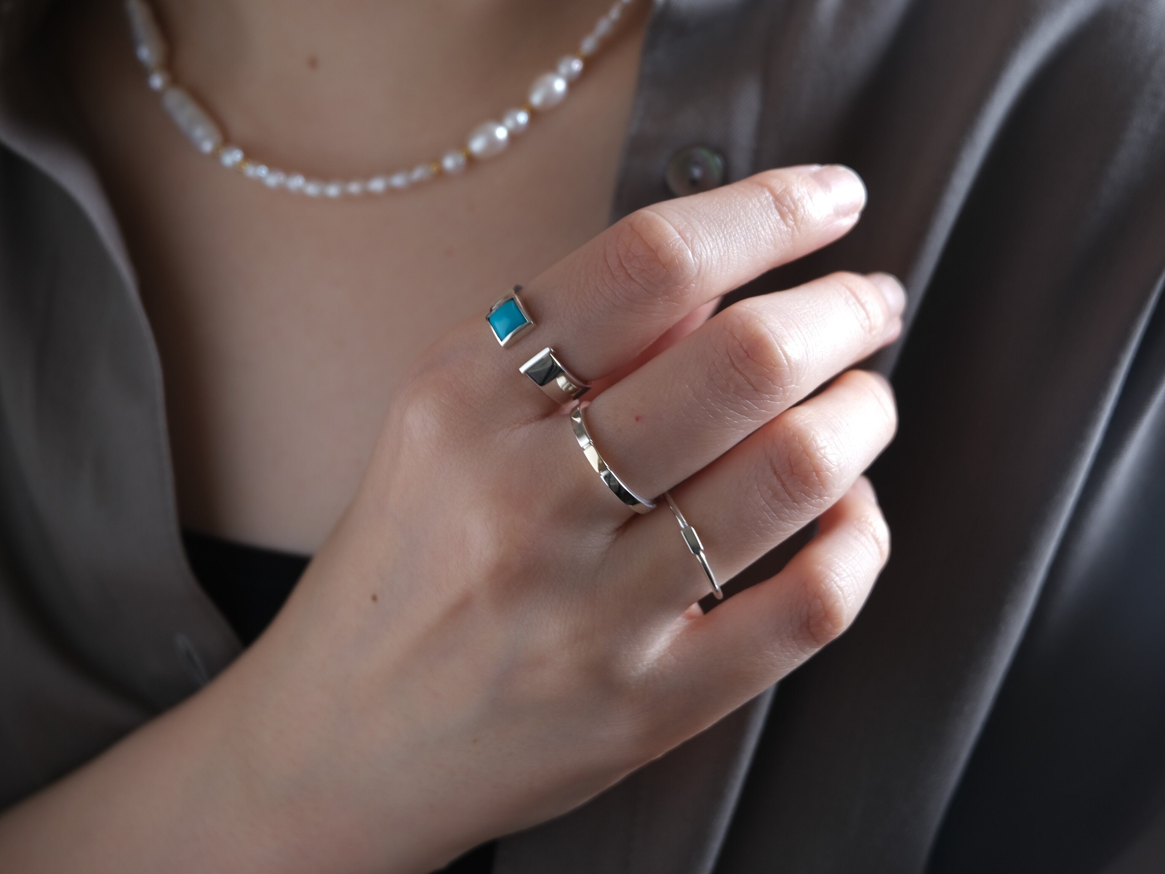 小さな横長の四角がポイントのミニマムなシルバーリング。