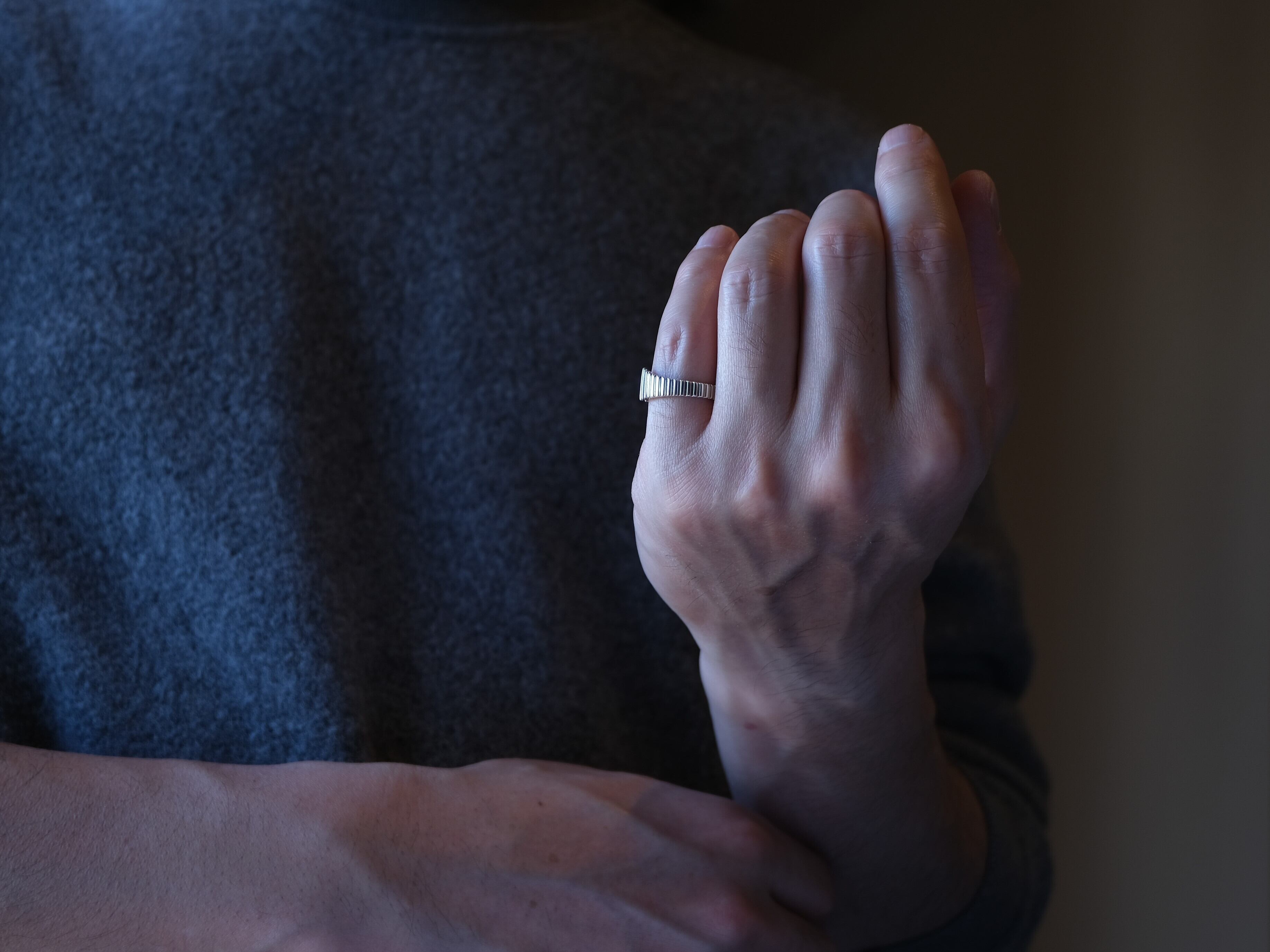 長い時間をかけて調整や試作を繰り返したカーブや着用感。また0.1㎜単位で柱のモチーフ部分や細部を幾度も調整したため、光に当たるときらりと反射する柱状のデザインを存分にお楽しみいただけます。