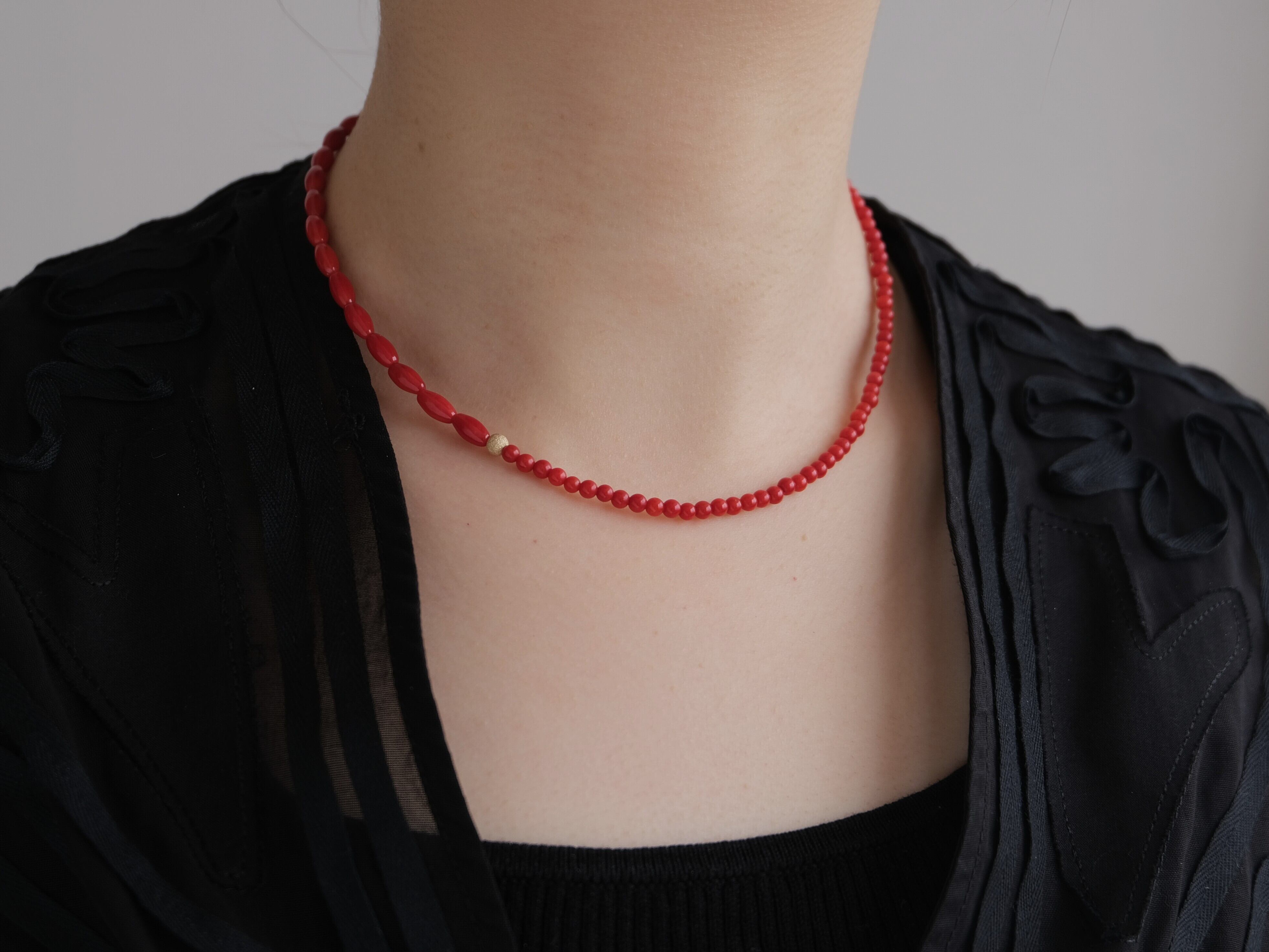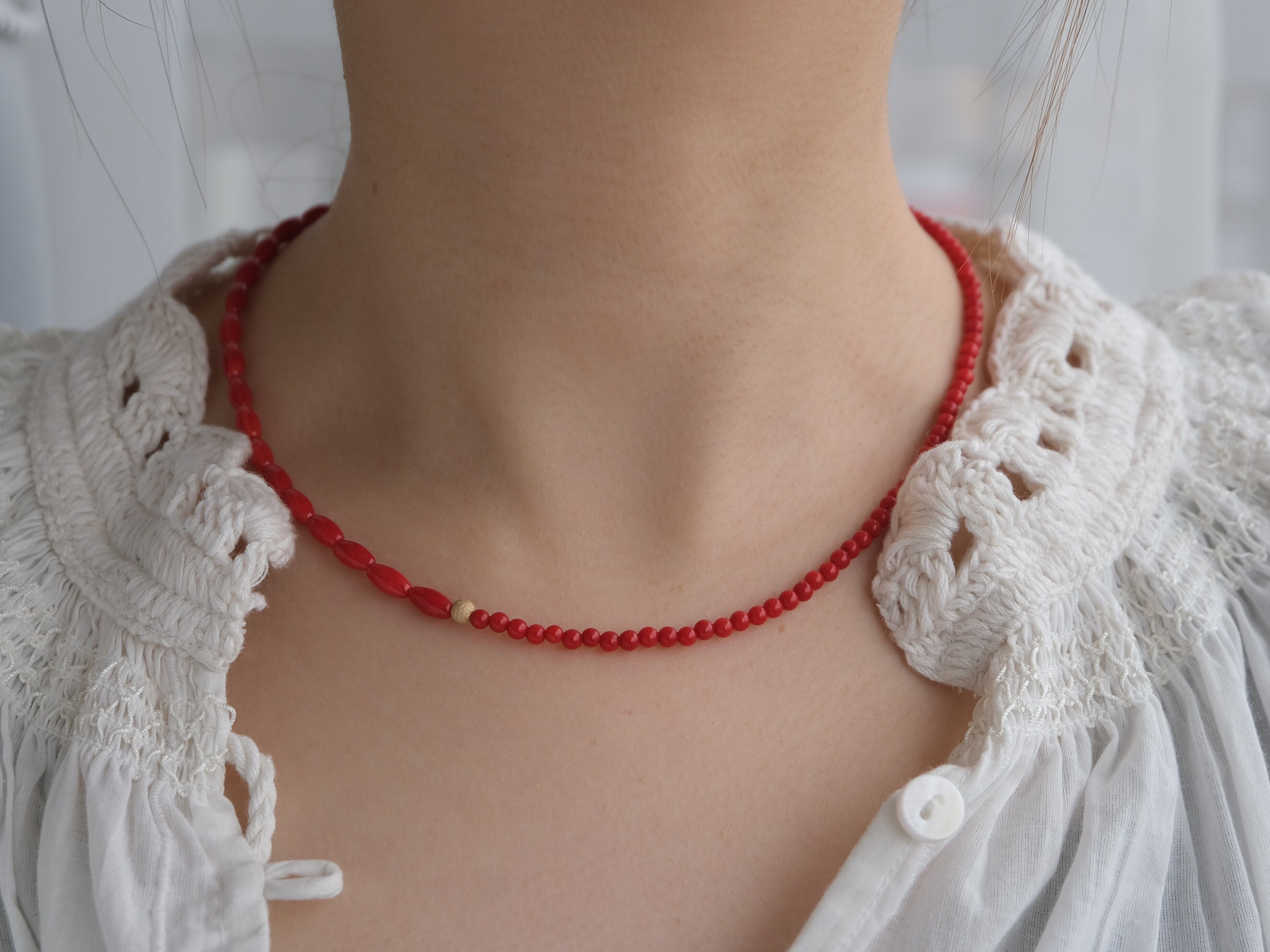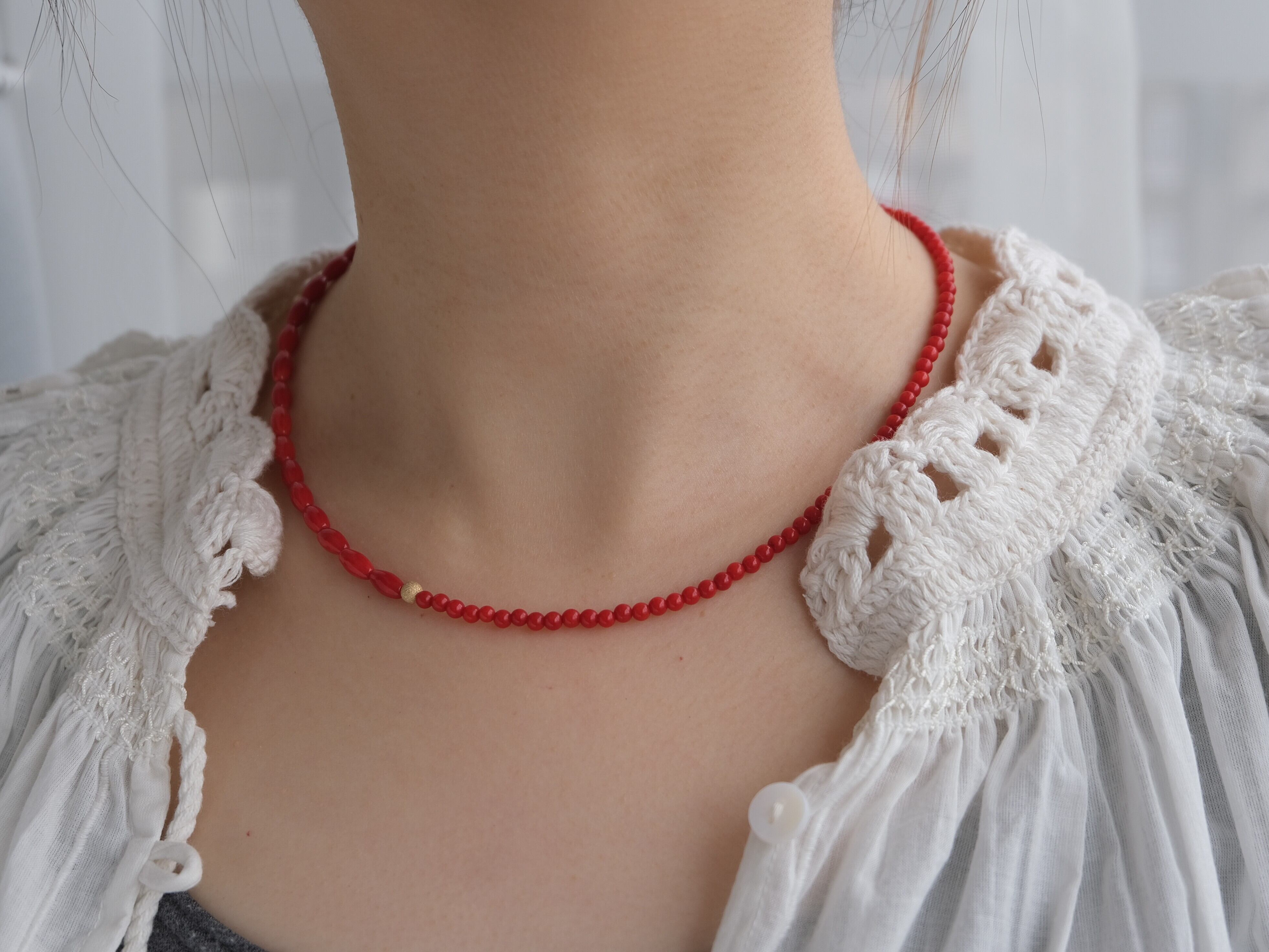 お洋服に合わせやすく、シンプルにTシャツに合わせるだけでも、コーディネートにこなれ感を出せるレッドカラーの染珊瑚のネックレス。