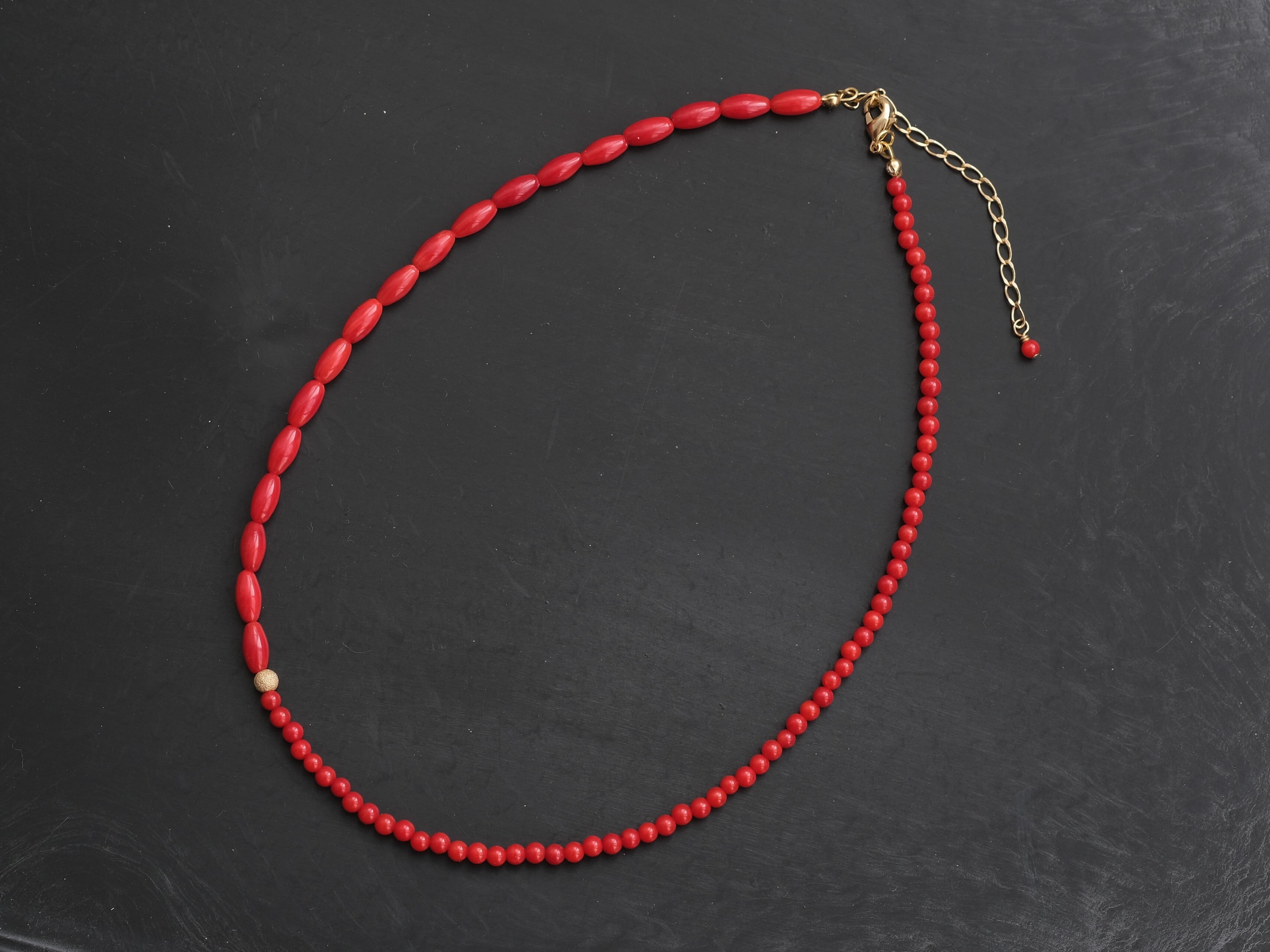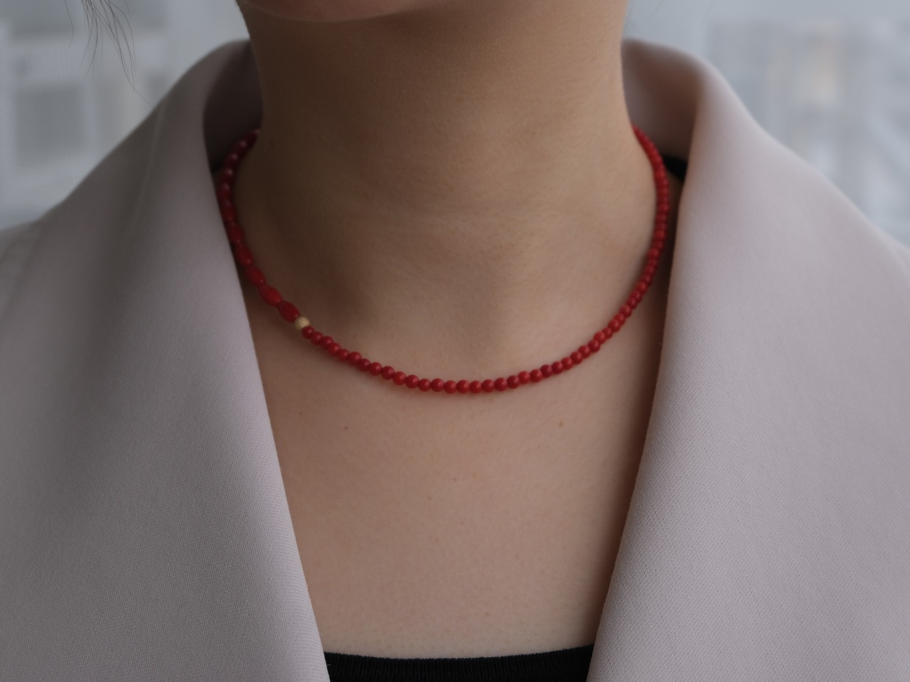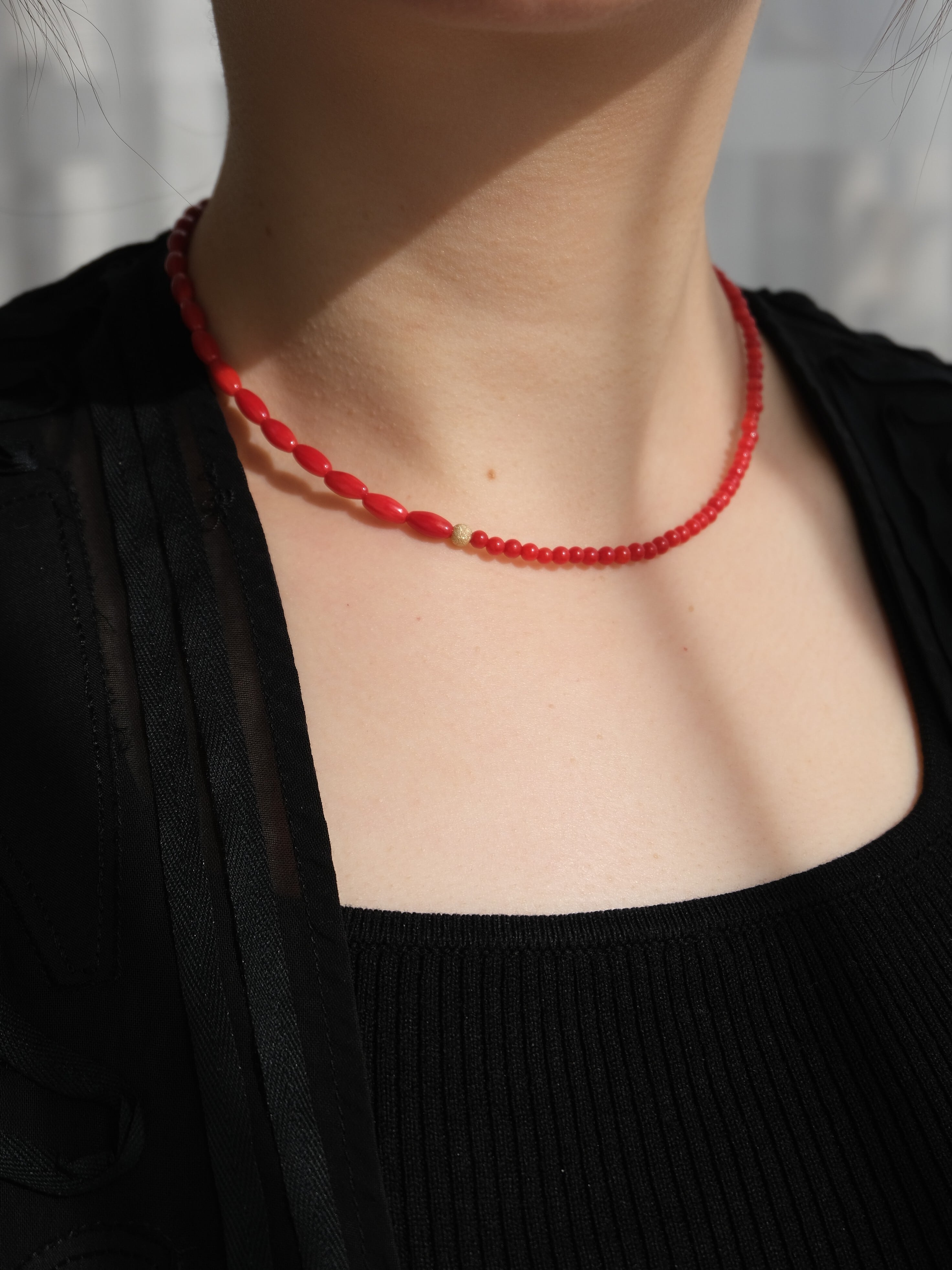 お洋服に合わせやすく、シンプルにTシャツに合わせるだけでも、コーディネートにこなれ感を出せるレッドカラーの染珊瑚のネックレス。