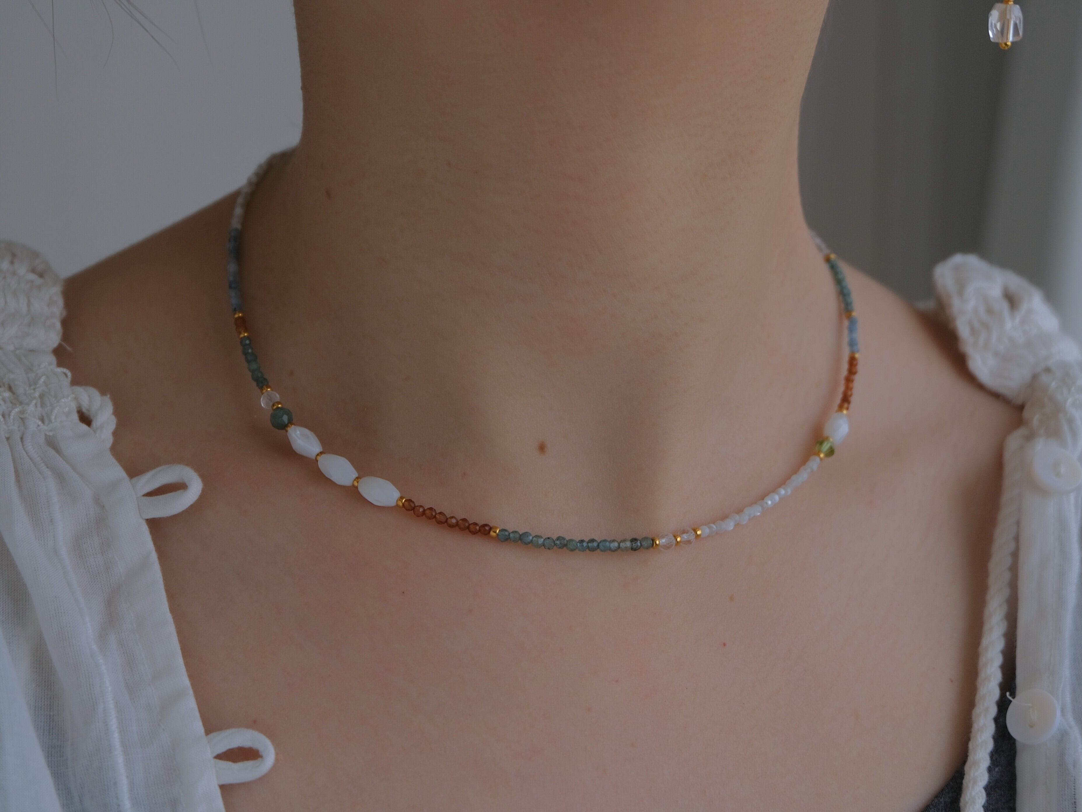 aquamarin &mother of pearl necklace:天然石アクアマリン マザーオブパール アパタイト ペリドット クオーツ 誕生石 ビーズネックレス