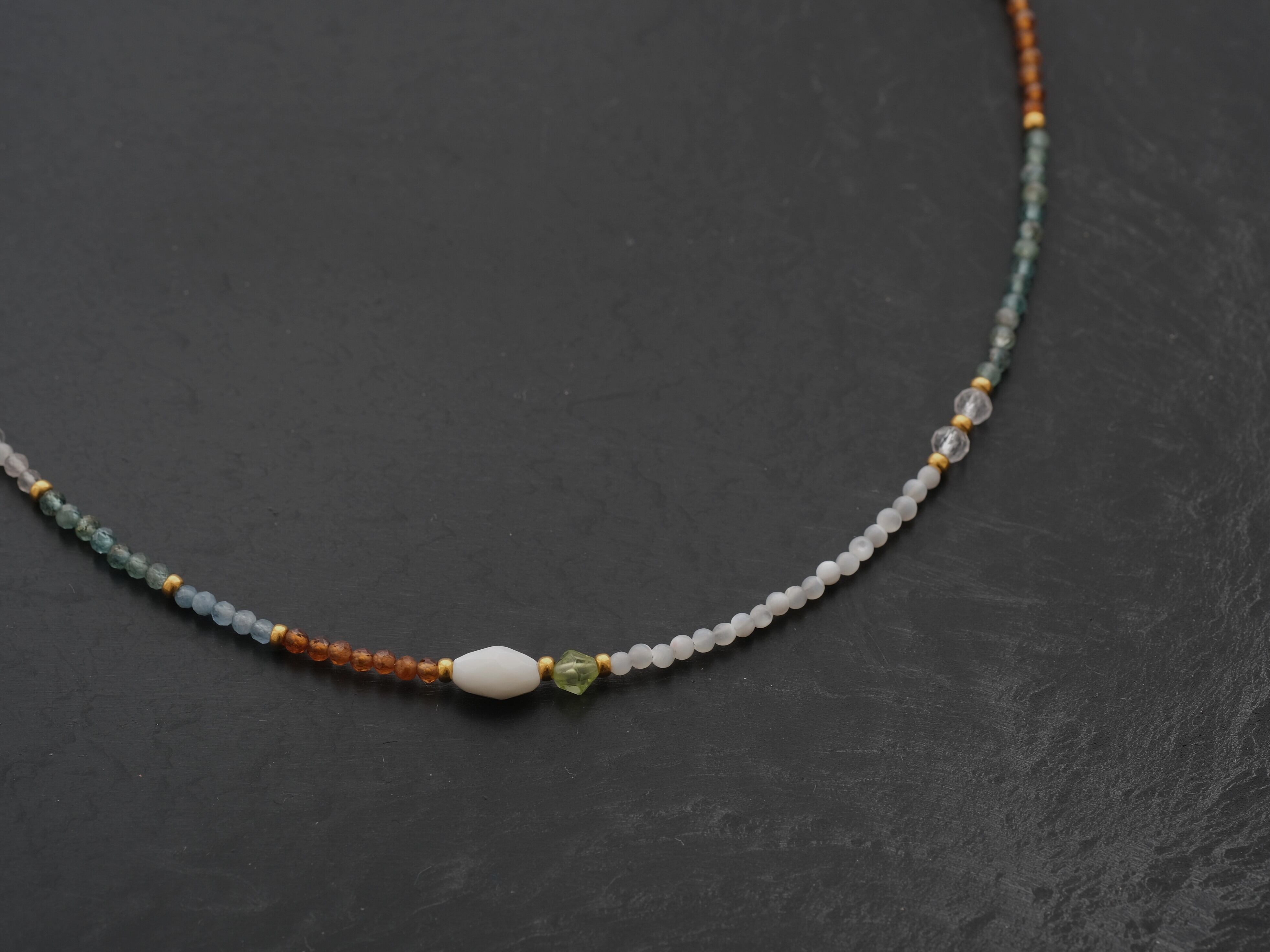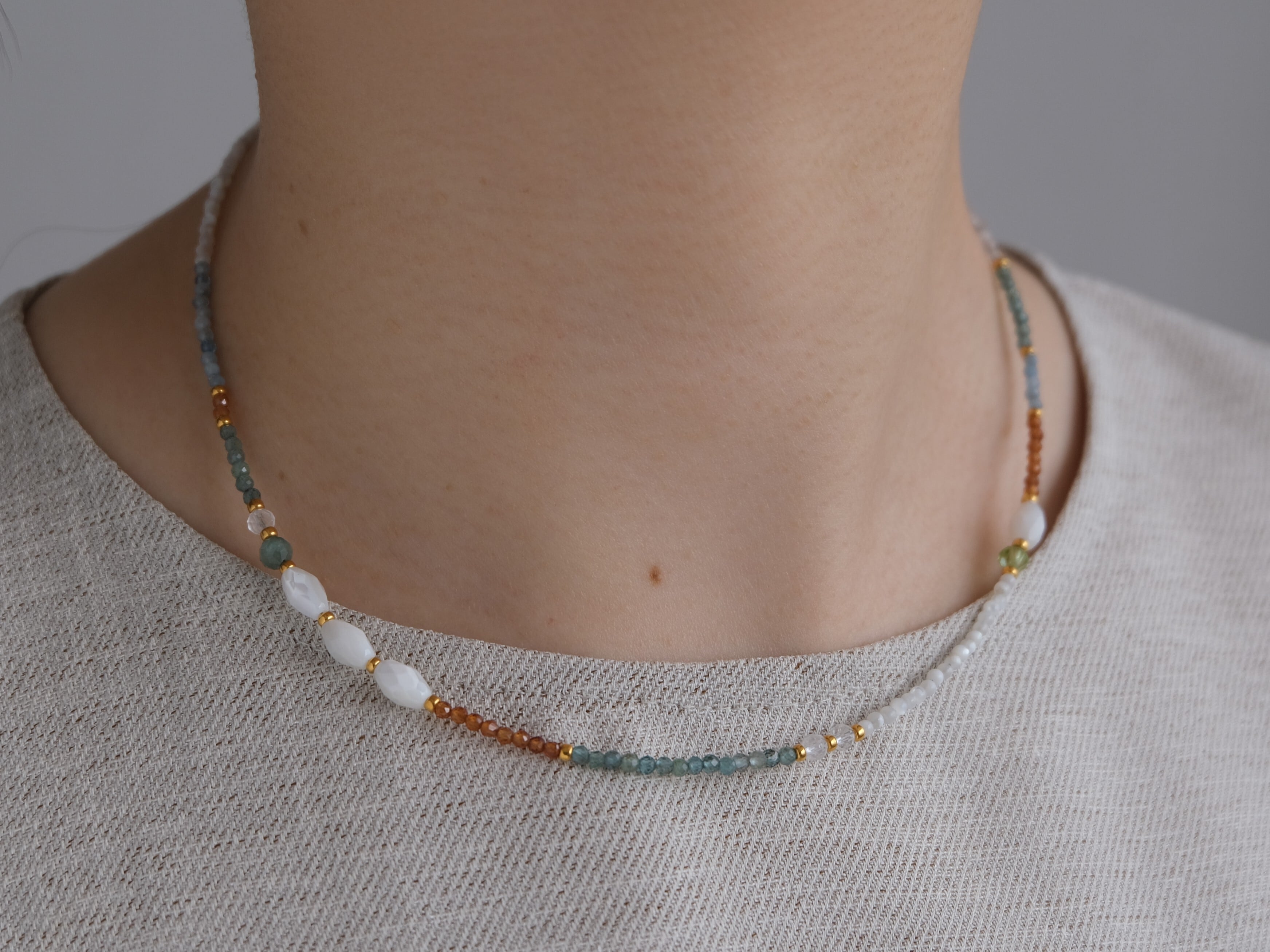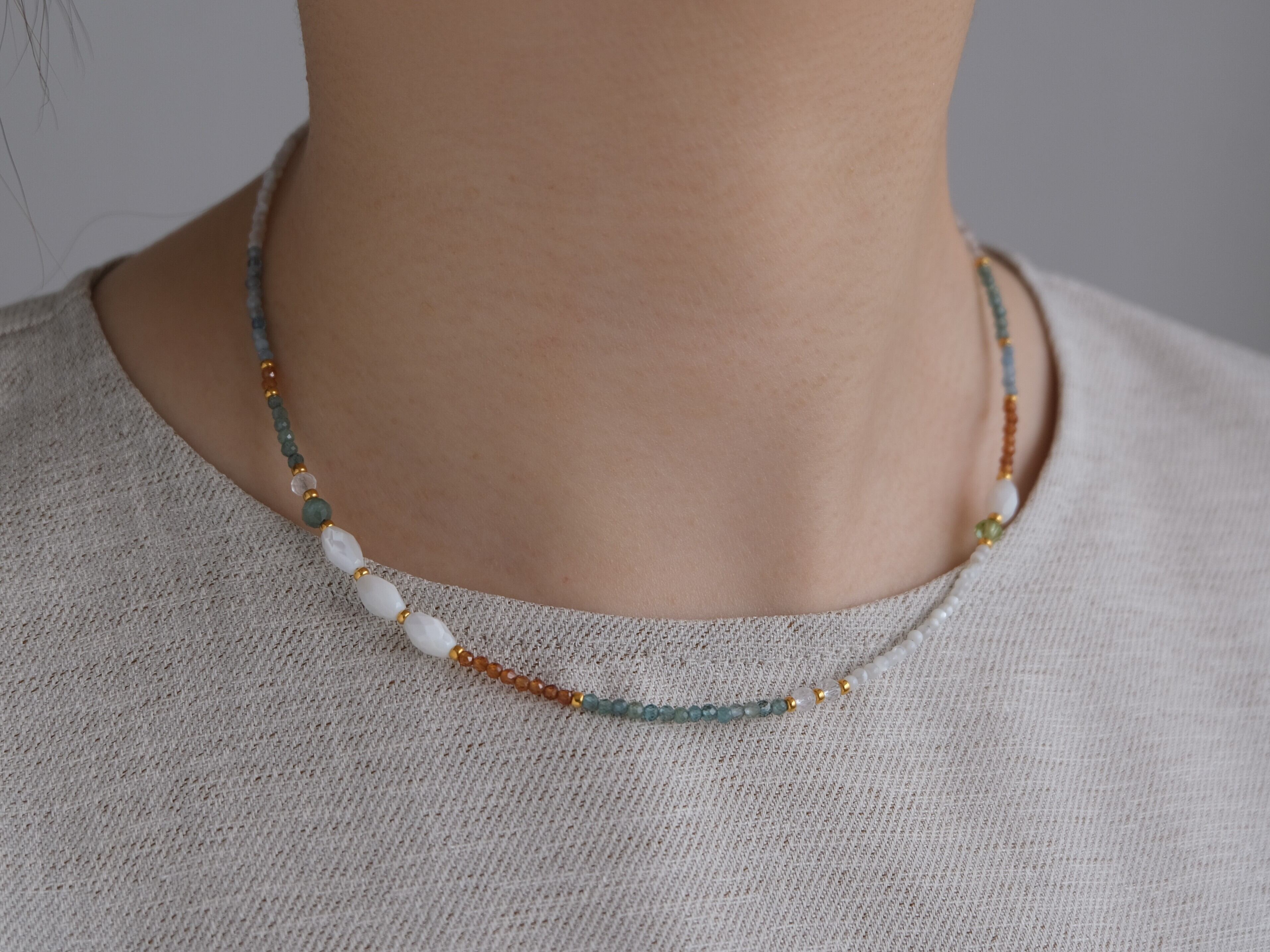 スクエア型のマザーオブパール(シェル)、アクアマリン、ブルーアパタイト、グレームーンストーン、ペリドット、ヘソナイトを組み合わせた天然石ネックレス
