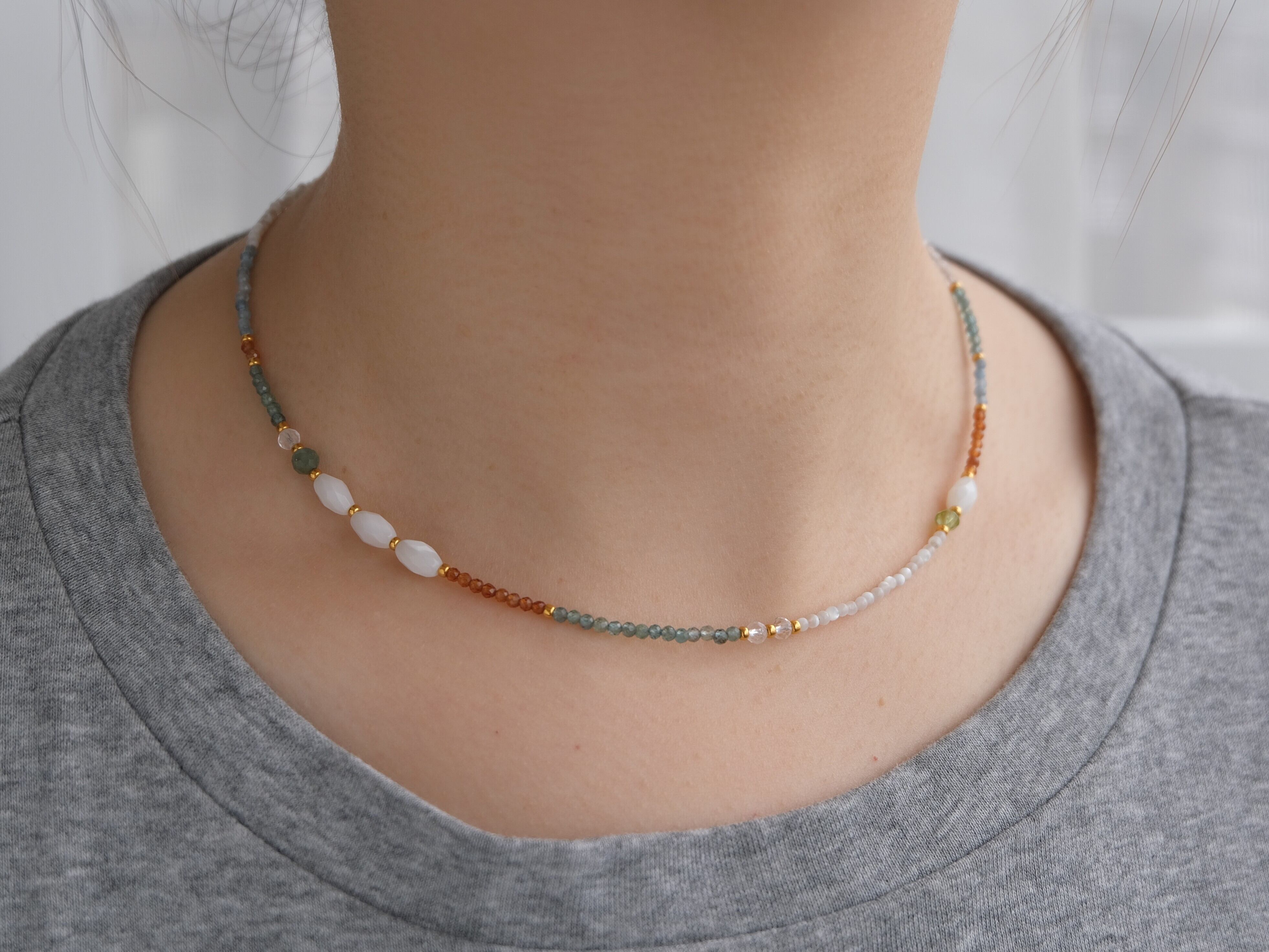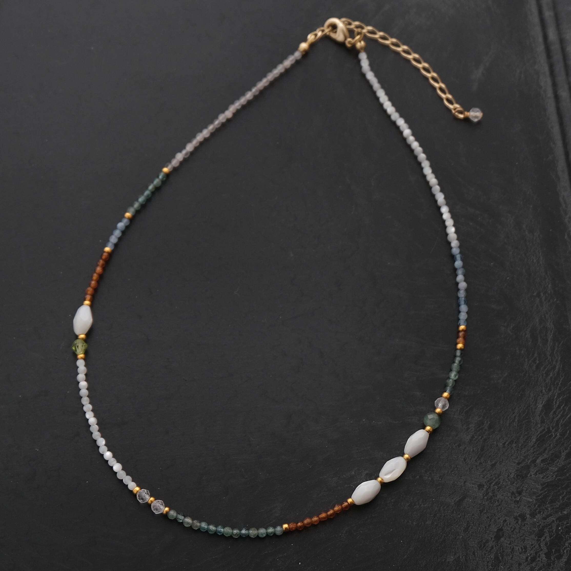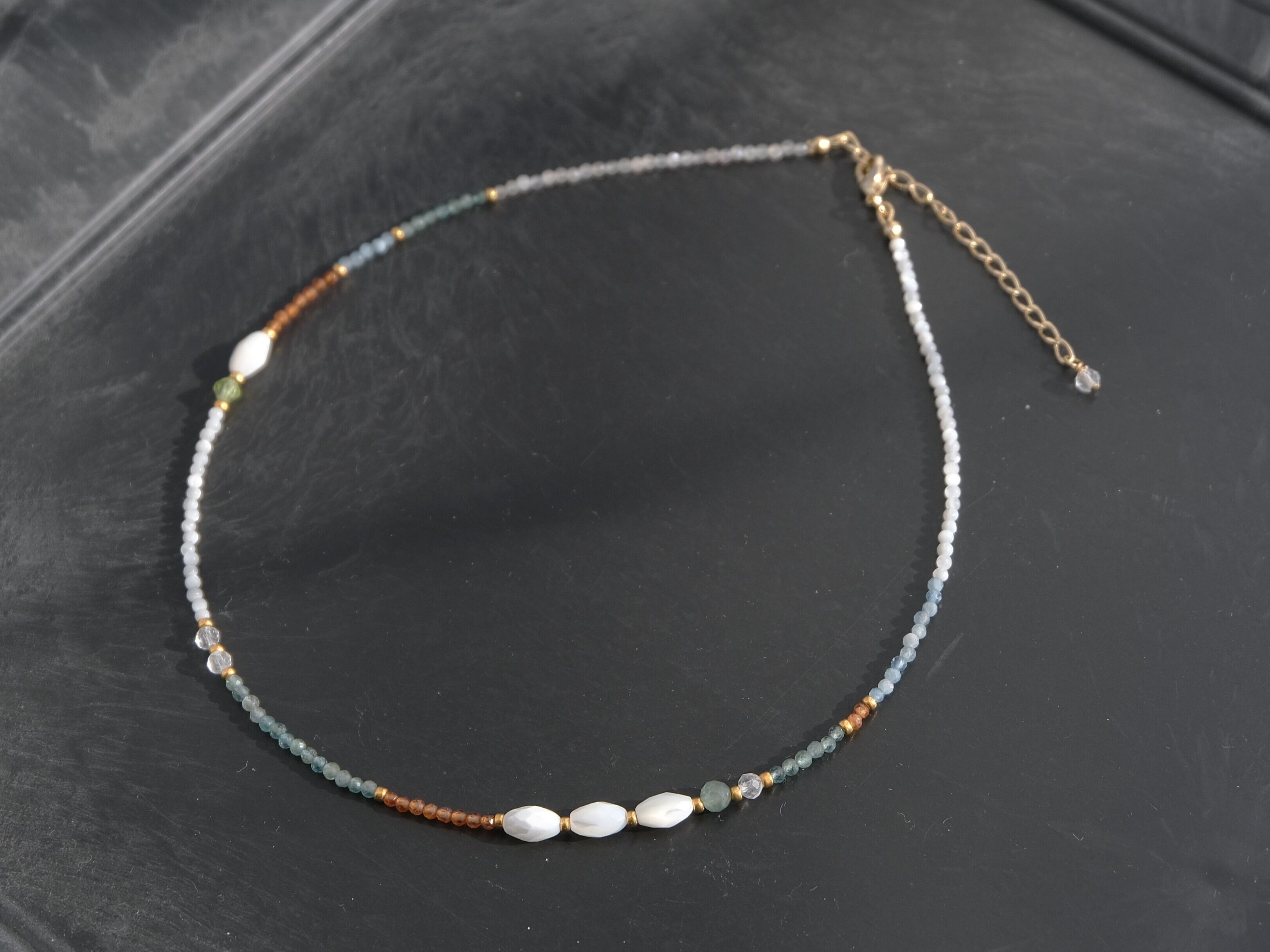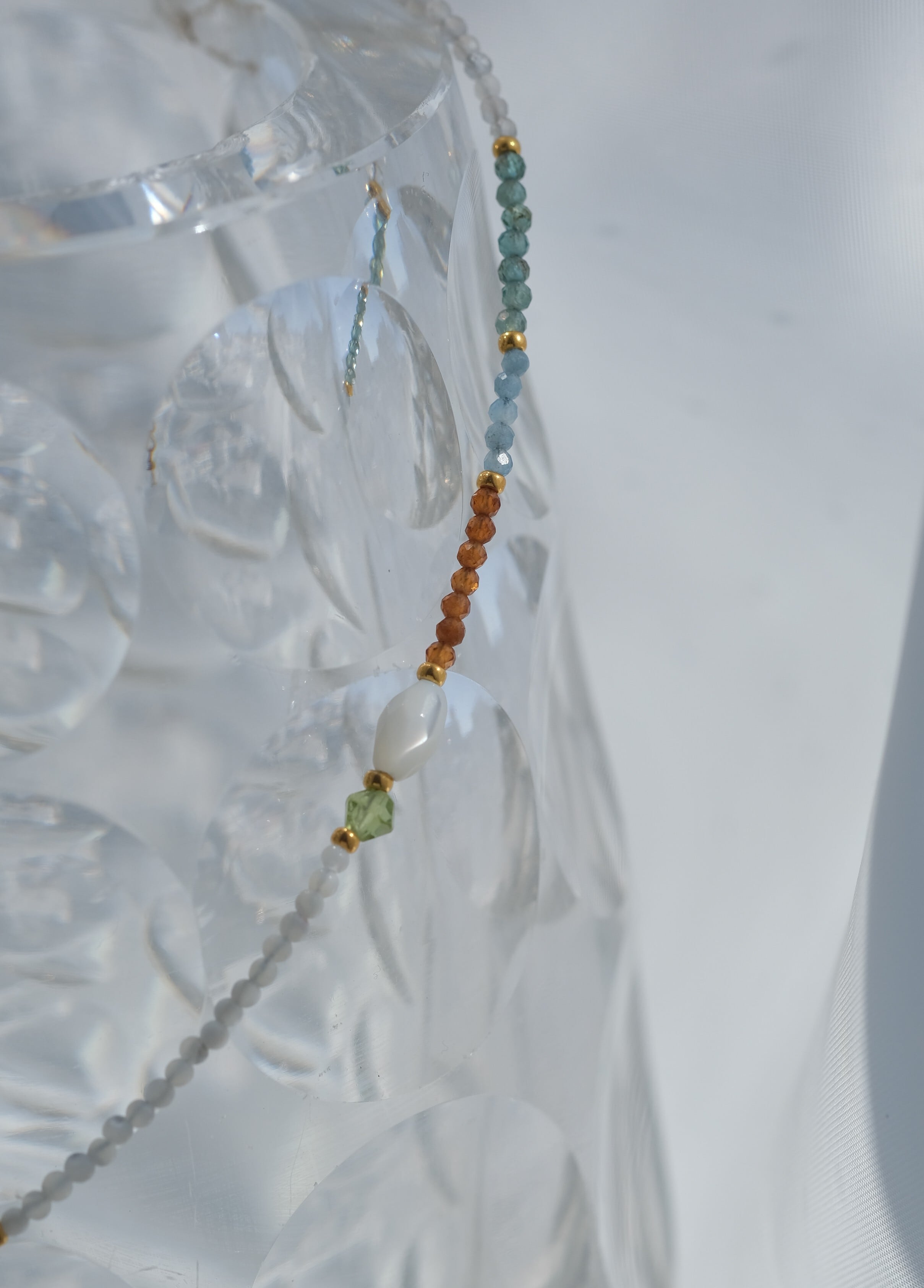 スクエア型のマザーオブパール(シェル)、アクアマリン、ブルーアパタイト、グレームーンストーン、ペリドット、ヘソナイトを組み合わせた天然石ネックレス
