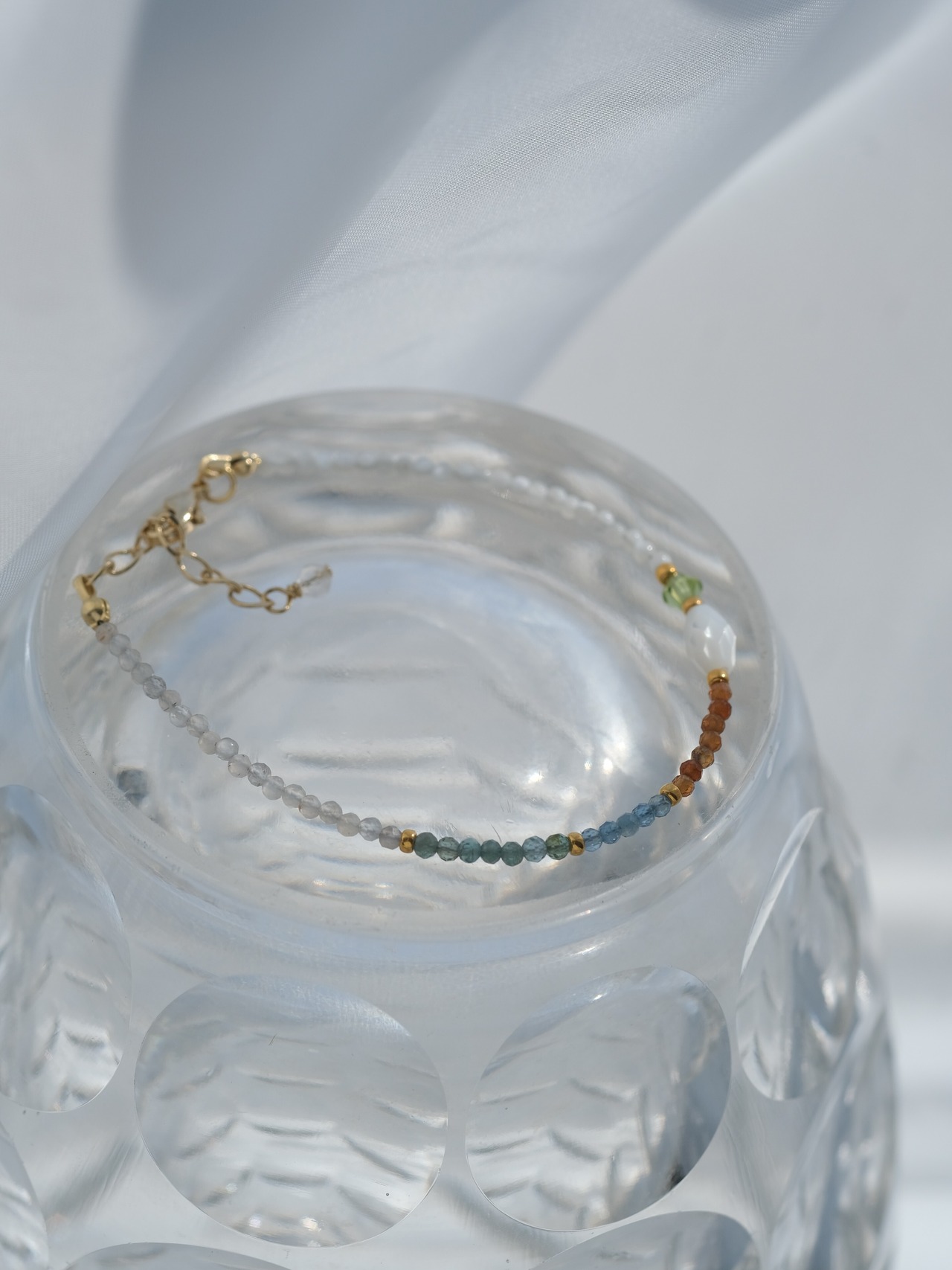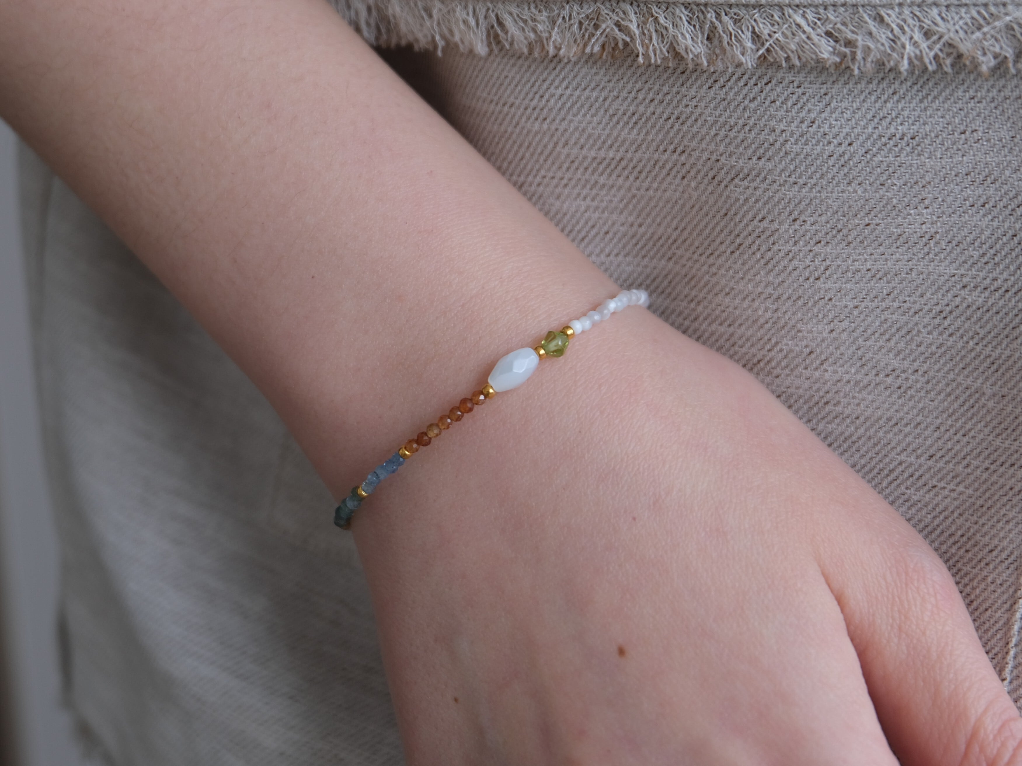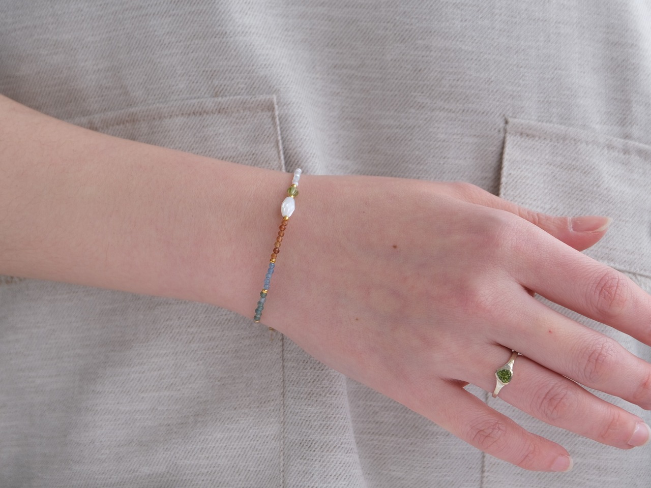 お洋服に合わせやすく、シンプルにTシャツに合わせるだけでも、コーディネートにこなれ感を出せる天然石ブレスレット。