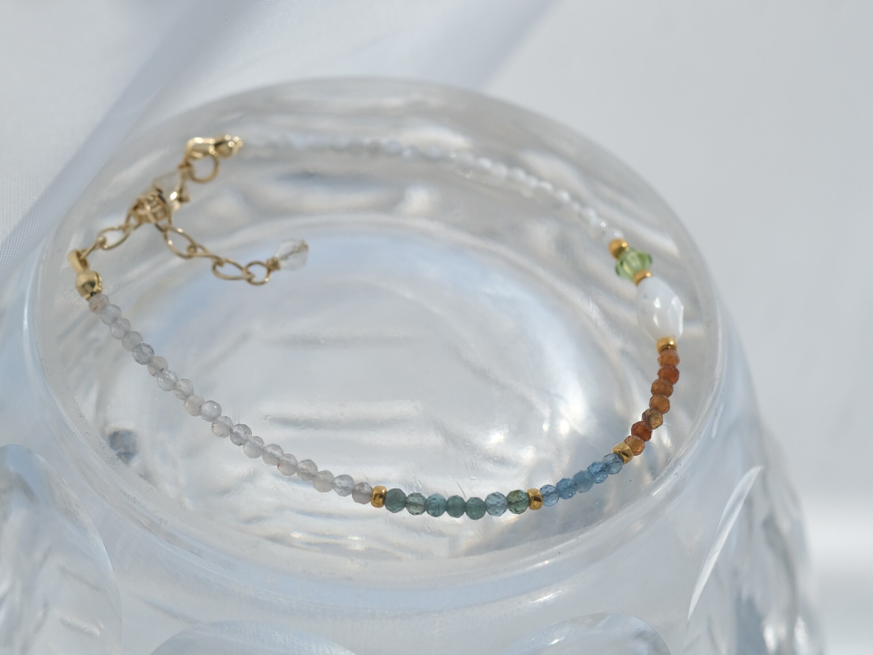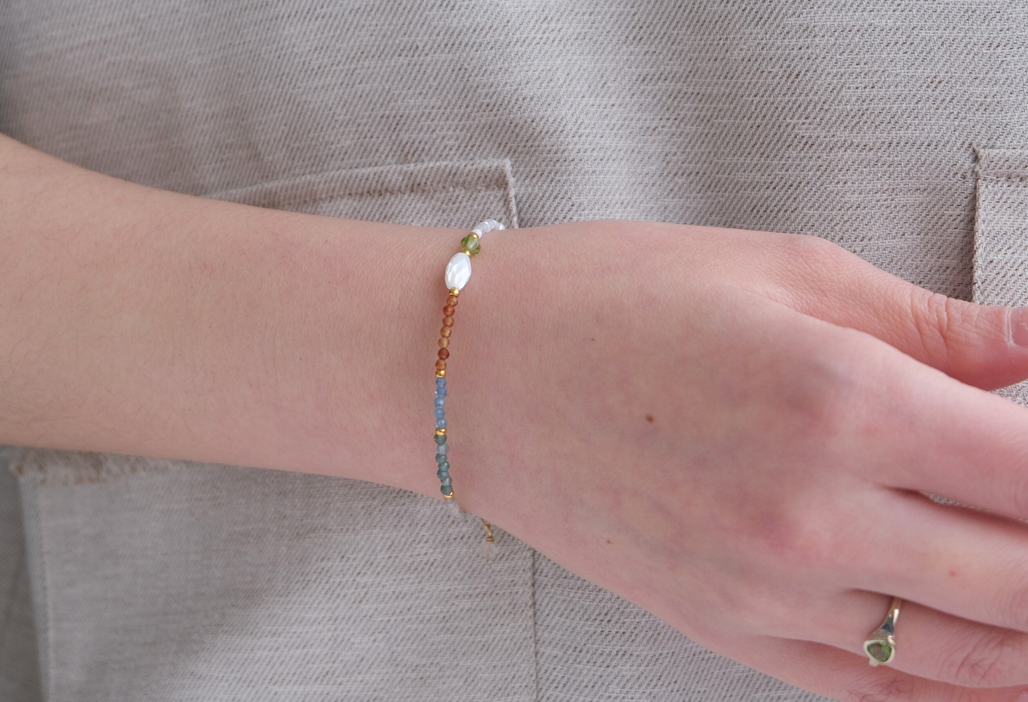 スクエア型のマザーオブパール(シェル)、アクアマリン、ブルーアパタイト、グレームーンストーン、ペリドット、ヘソナイトを組み合わせた天然石ブレスレット