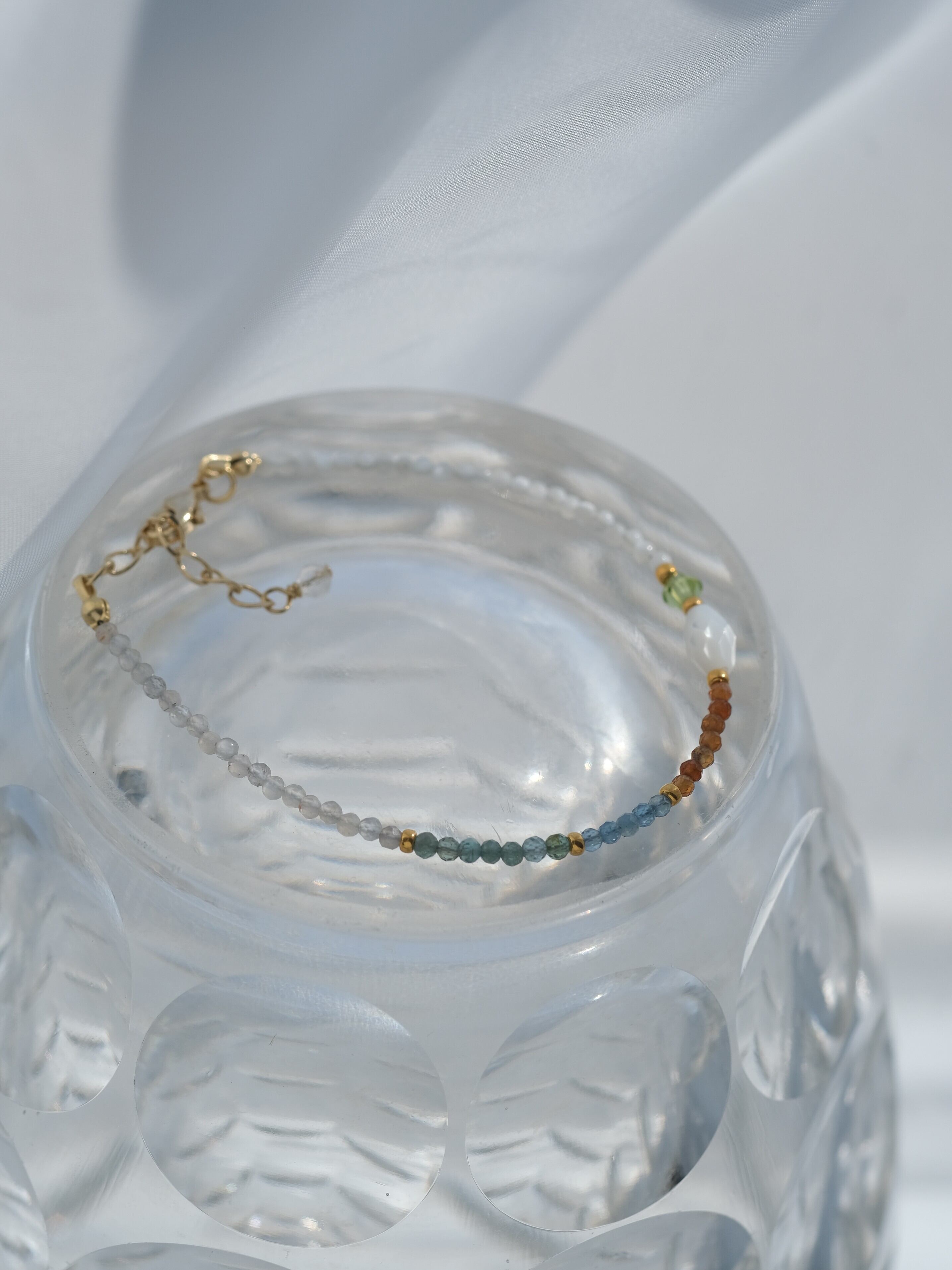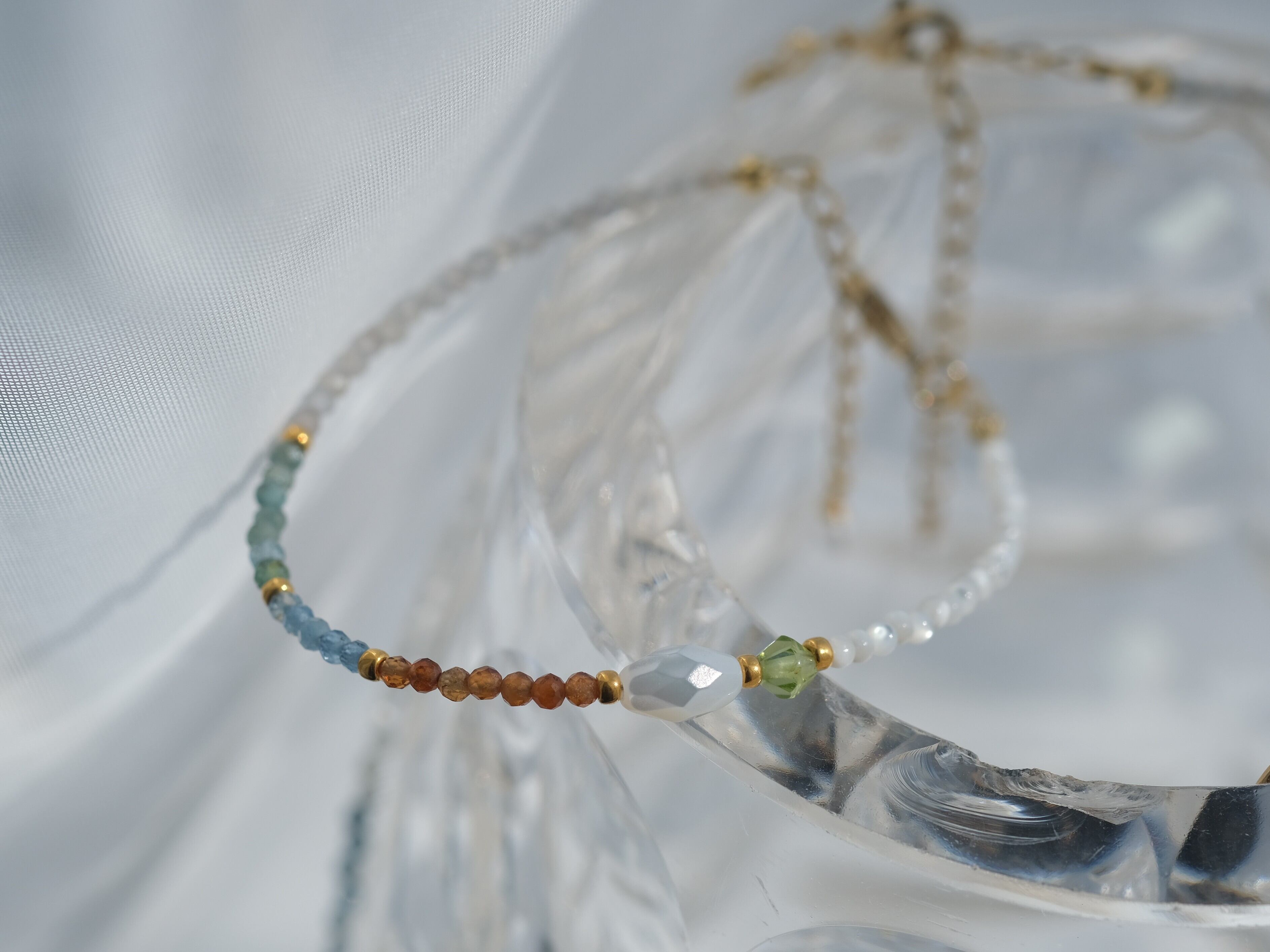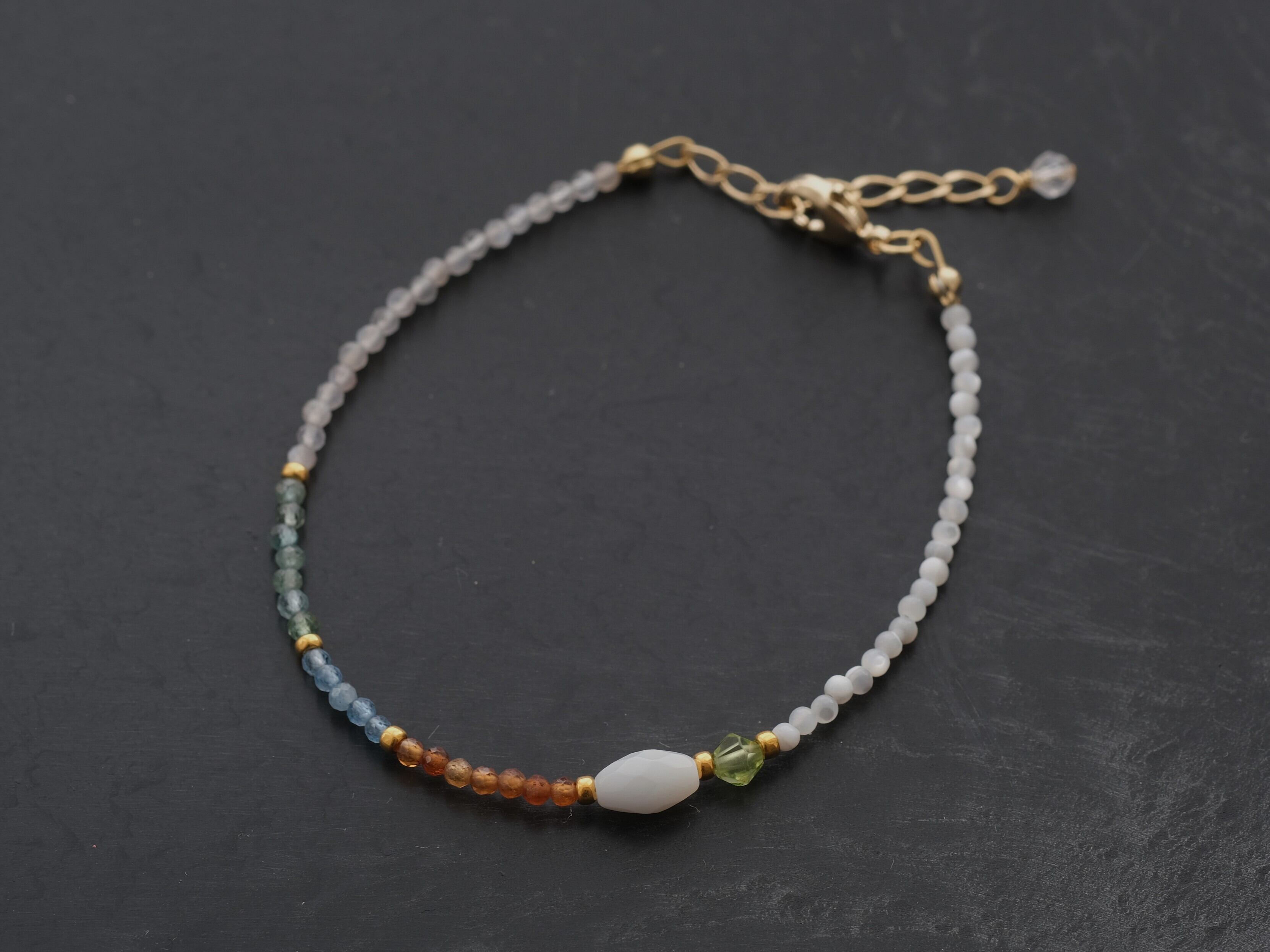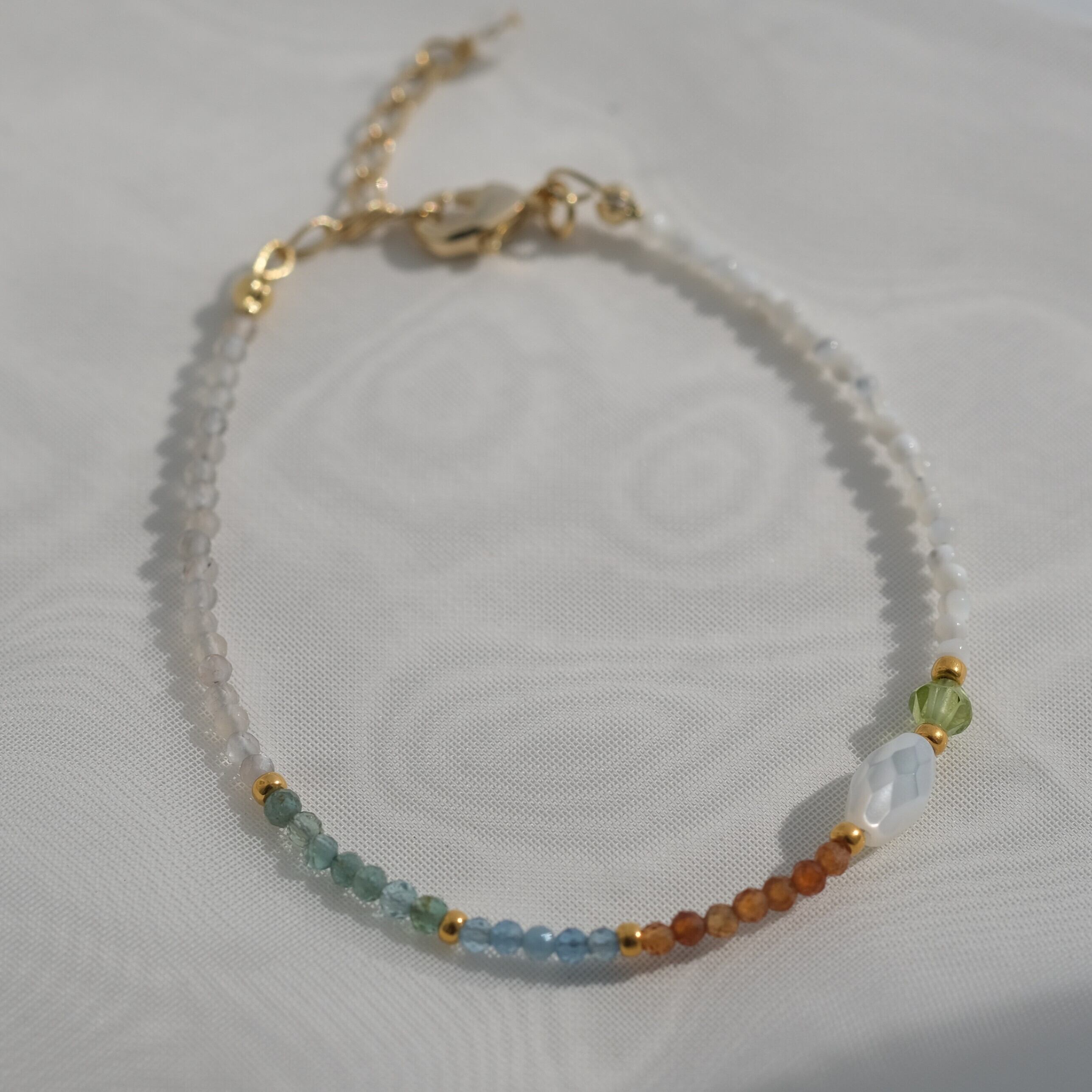 aquamarin &mother of pearl bracelet:天然石ブレスレット アクアマリン マザーオブパール アパタイト ヘソナイト ガーネット オレンジ ペリドット シェル お守り