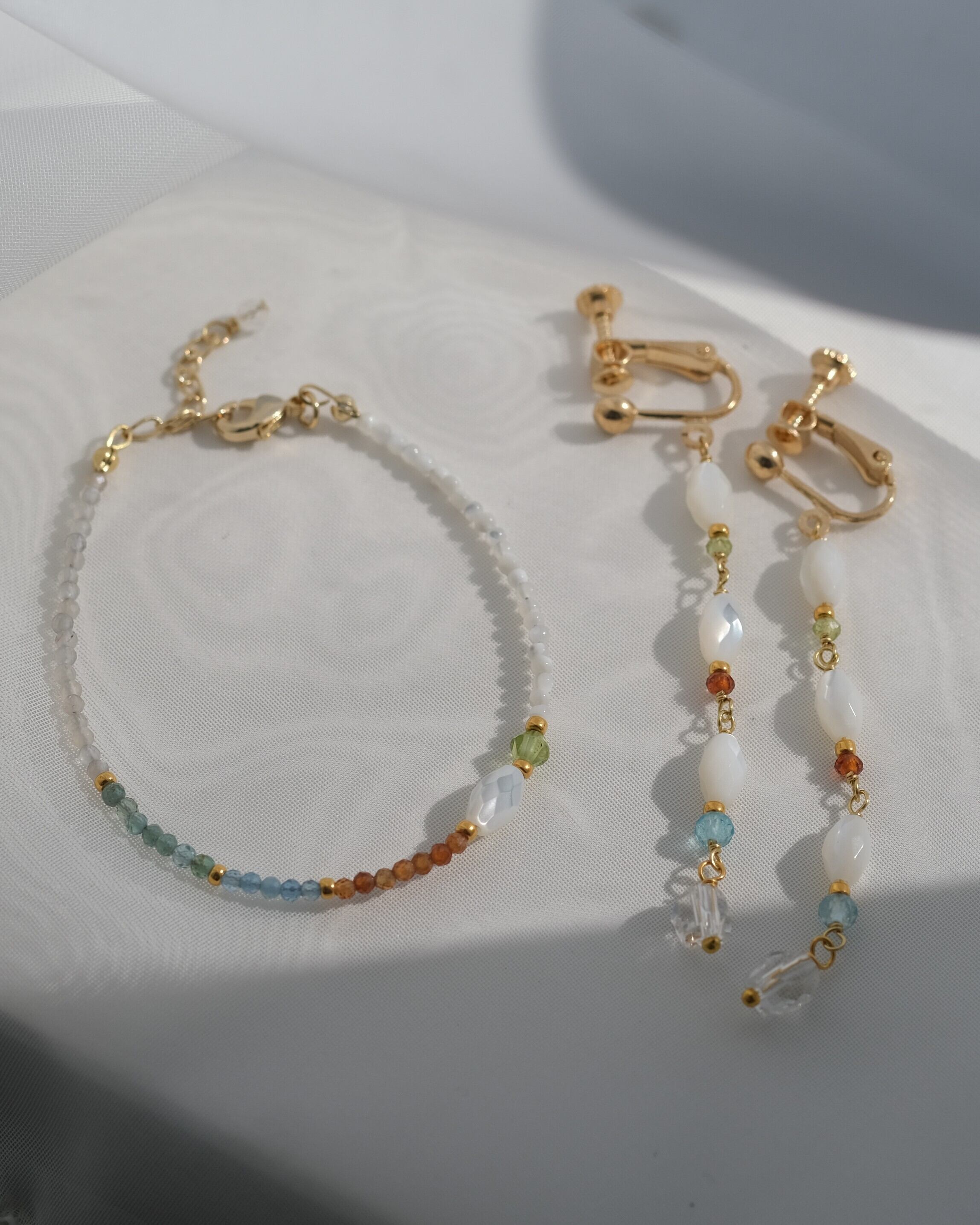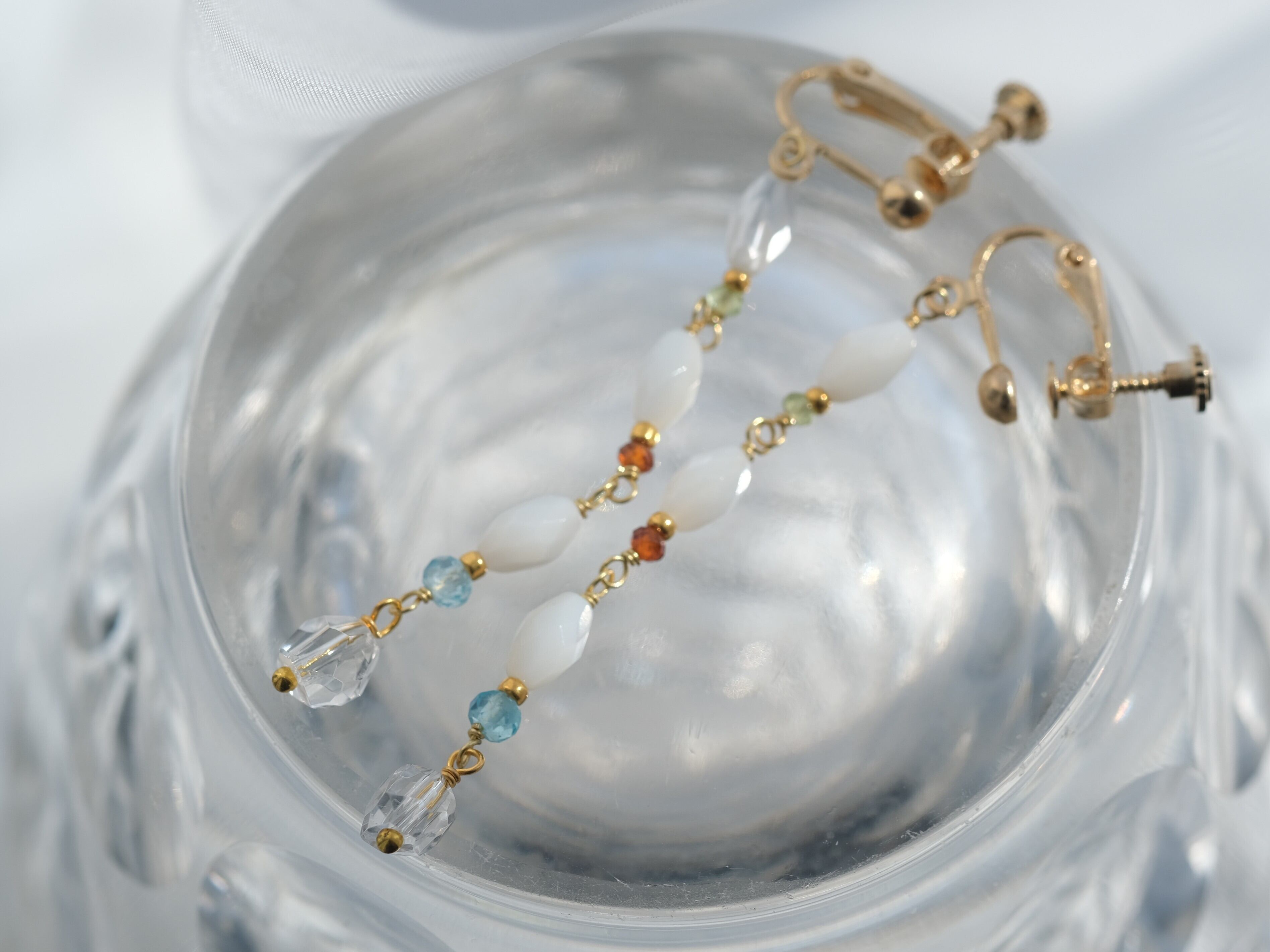 ラフなカットのクオーツとロングデザインで洗練された印象に。繊細さもありつつ鮮やかなブルーやオレンジカラーは力強く存在感を放ちます。