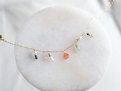 鮮やかな天然石とゴールドフィールドのチェーン、パキっとした鮮やかなシーブルーカラーやオレンジの組み合わせがポイントになり、コーディネートがぐっと華やかになります。