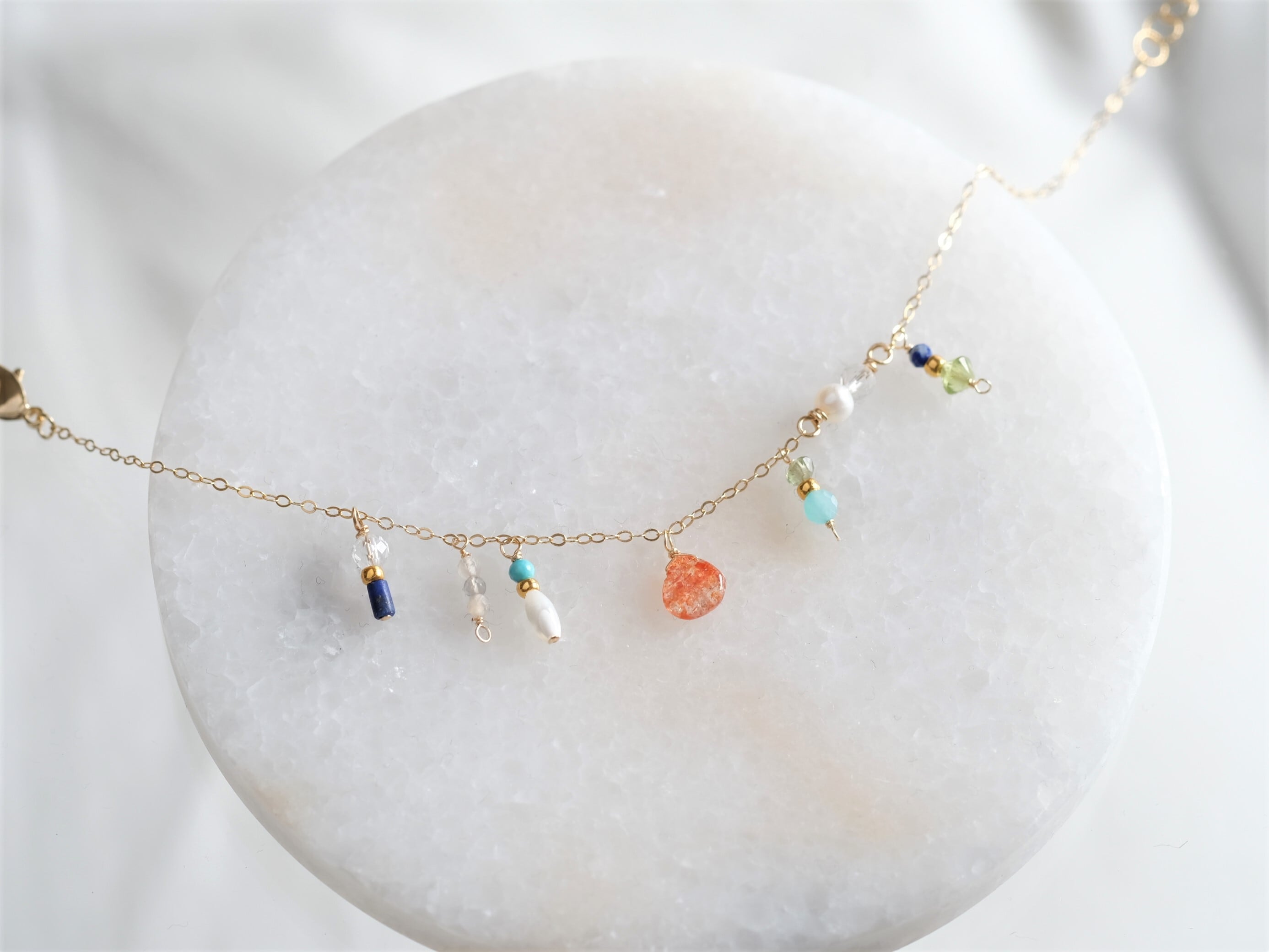 Orange sun stone bracelet:オレンジサンストーン チェーンブレスレット 天然石 ラピスラズリ×クォーツ×淡水パール×ペリドット×アパタイト
