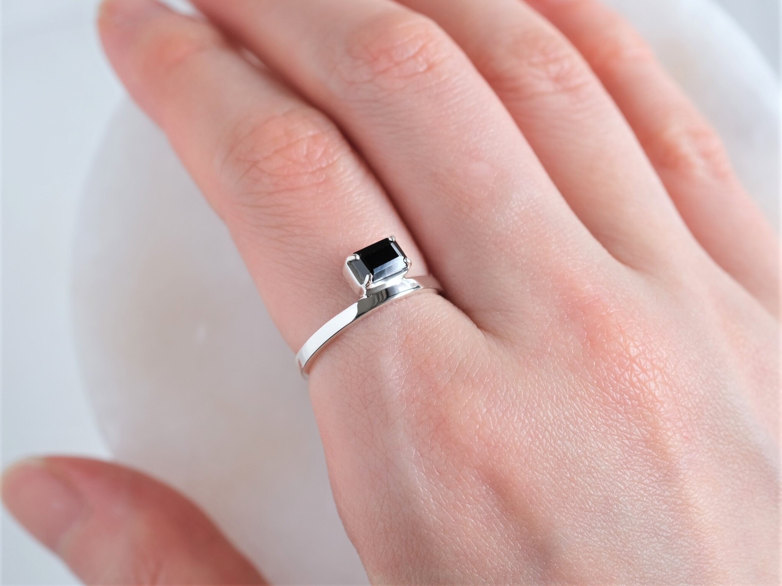 長方形(レクタングル)の天然石ブラックスピネルを、スタイリッシュなデザインリングに仕上げました。