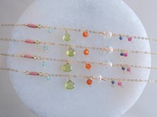 8月の誕生石ペリドットをメインに、小粒の天然石や淡水パールを一粒一粒丁寧に繋いだ天然石チェーンブレスレット