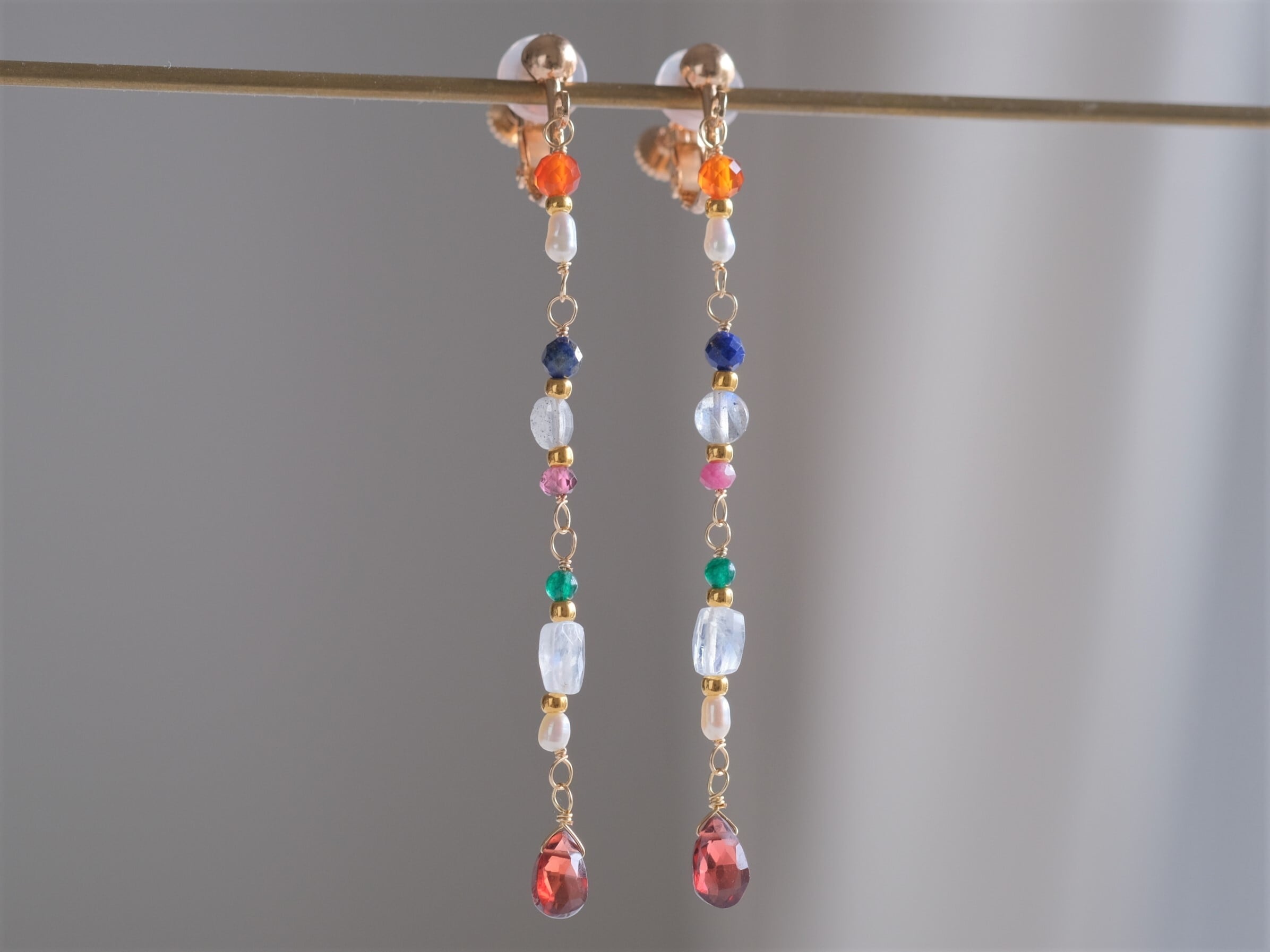 レインボームーンストーン、ルビー、ラブラドライト、ラピスラズリ、カーネリアン、ライスのような形の淡水パールを組み合わせたピアス・イヤリング