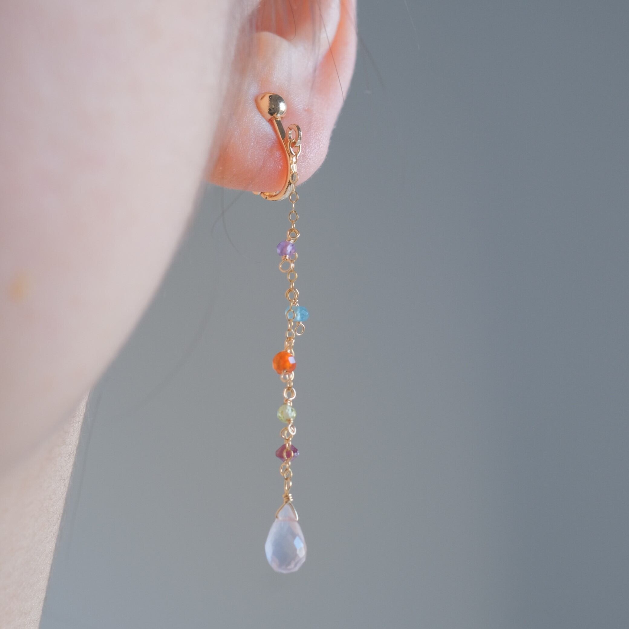 淡いピンクのローズクォーツに小粒のペリドットやアメジスト、ネオンブルーアパタイト、ロードライトガーネット、カーネリアンと天然石が小さく揺れて、コーディネートを華やかにします。