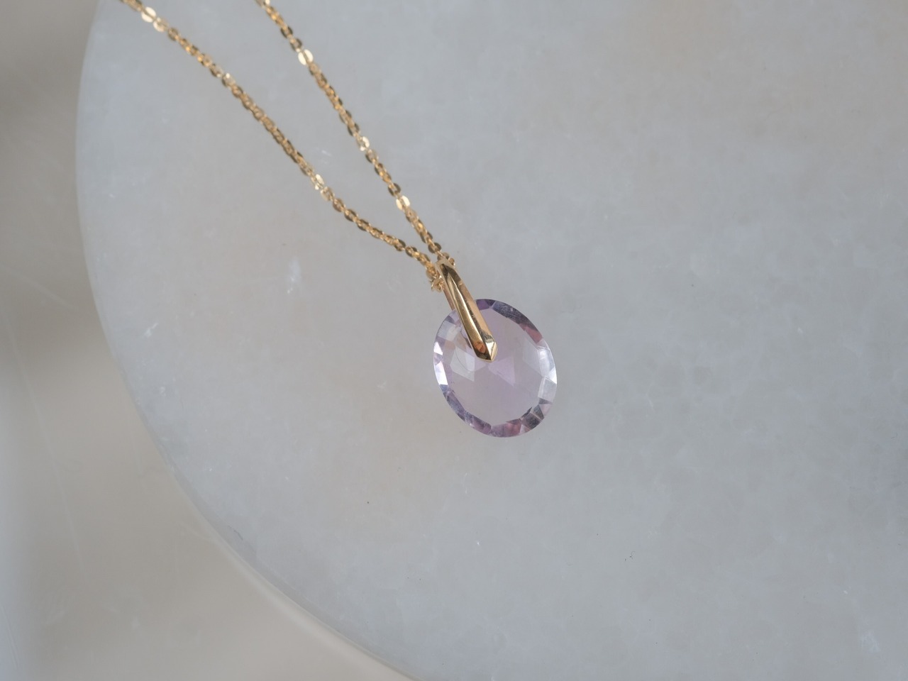 透明感のあるピンクパープルカラーのアメジストの表面にカットを施し、動くたびに光に反射して仄かに煌めきます。